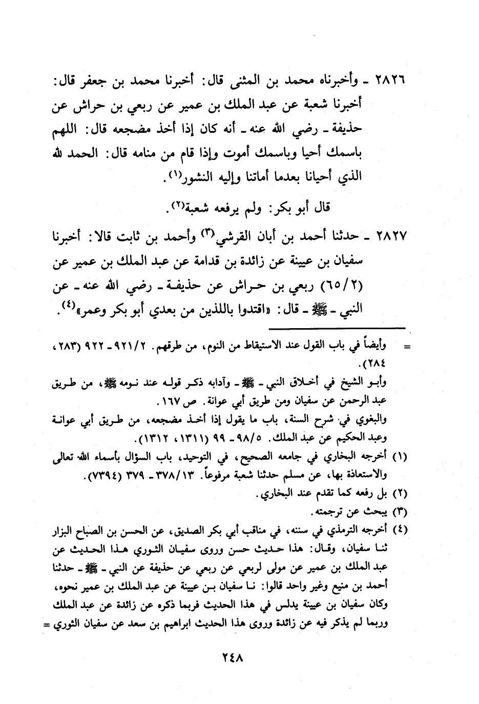 2826 - وَأَخْبَرَنَاهُ مُحَمَّدُ بْنُ الْمُثَنَّى، قَالَ: أَخْبَرَنَا مُحَمَّدُ بْنُ جَعْفَرٍ، قَالَ: أَخْبَرَنَا شُعْبَةُ، عَنْ عَبْدِ الْمَلِكِ بْنِ عُمَيْرٍ، عَنْ رِبْعِيِّ بْنِ حِرَاشٍ، عَنْ حُذَيْفَةَ رَضِيَ اللَّهُ عَنْهُ أَنَّهُ كَانَ إِذَا أَخَذَ مَضْجَعَهُ قَالَ: «§اللَّهُمَّ بِاسْمِكَ أَحْيَا وَبِاسْمِكَ أَمُوتُ» ، وَإِذَا قَامَ مِنْ مَنَامِهِ، قَالَ: «الْحَمْدُ لِلَّهِ الَّذِي أَحْيَانَا بَعْدَمَا أَمَاتَنَا وَإِلَيْهِ النُّشُورُ» ، قَالَ أَبُو بَكْرٍ: وَلَمْ يَرْفَعْهُ شُعْبَةُ