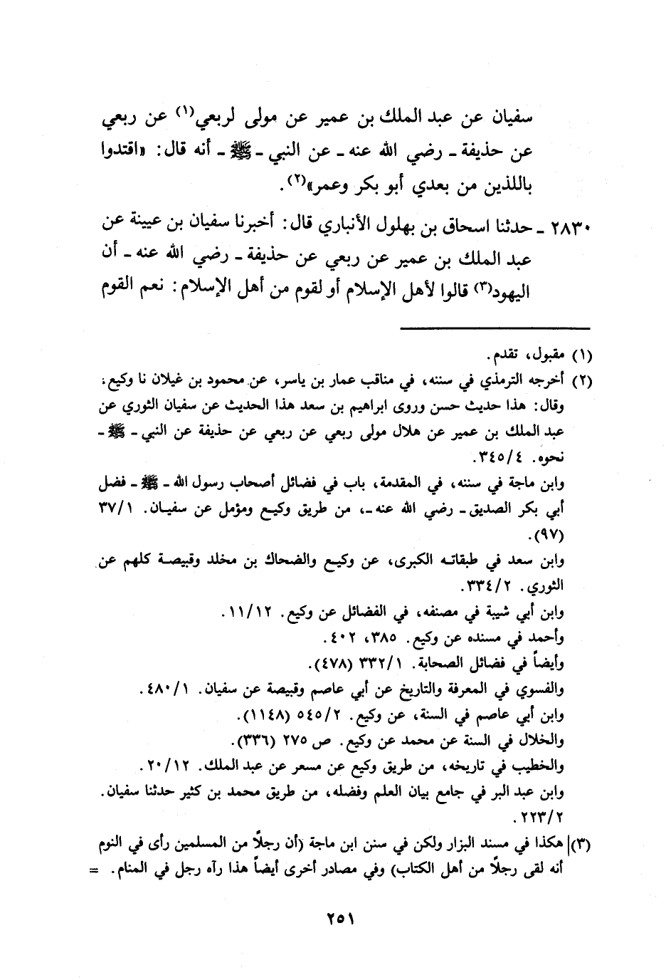 2830 - حَدَّثَنَا إِسْحَاقُ بْنُ بُهْلُولٍ الْأَنْبَارِيُّ، قَالَ: أَخْبَرَنَا سُفْيَانُ بْنُ عُيَيْنَةَ، عَنْ عَبْدِ الْمَلِكِ بْنِ عُمَيْرٍ، عَنْ رِبْعِيٍّ، عَنْ حُذَيْفَةَ رَضِيَ اللَّهُ عَنْهُ أَنَّ الْيَهُودَ، قَالُوا لِأَهْلِ الْإِسْلَامِ أَوْ لِقَوْمٍ مِنْ أَهْلِ الْإِسْلَامِ: نِعْمَ الْقَوْمُ -[252]- أَنْتُمْ لَوْلَا أَنَّكُمْ تَقُولُونَ مَا شَاءَ اللَّهُ وَمَا شَاءَ مُحَمَّدٌ، فَبَلَغَ ذَلِكَ النَّبِيَّ صَلَّى اللهُ عَلَيْهِ وَسَلَّمَ فَقَالَ: " §لَا تَقُولُوا مَا شَاءَ اللَّهُ وَمَا شَاءَ مُحَمَّدٌ، وَلَكِنْ قُولُوا: مَا شَاءَ اللَّهُ وَحْدَهُ " هَكَذَا قَالَ ابْنُ عُيَيْنَةَ، عَنْ عَبْدِ الْمَلِكِ، عَنْ رِبْعِيٍّ، عَنْ حُذَيْفَةَ، وَقَالَ شُعْبَةُ، وَأَبُو عَوَانَةَ، عَنْ عَبْدِ الْمَلِكِ، عَنْ رِبْعِيِّ بْنِ حِرَاشِ، عَنِ الطُّفَيْلِ أَخِي عَائِشَةَ لِأُمِّهَا -[253]-، وَقَالَ مَعْمَرٌ، عَنْ عَبْدِ الْمَلِكِ بْنِ عُمَيْرٍ، عَنْ جَابِرِ بْنِ سَمُرَةَ، وَالصَّوَابُ حَدِيثُ عَبْدِ الْمَلِكِ، عَنْ رِبْعِيٍّ، عَنِ الطُّفَيْلِ أَخِي عَائِشَةَ.