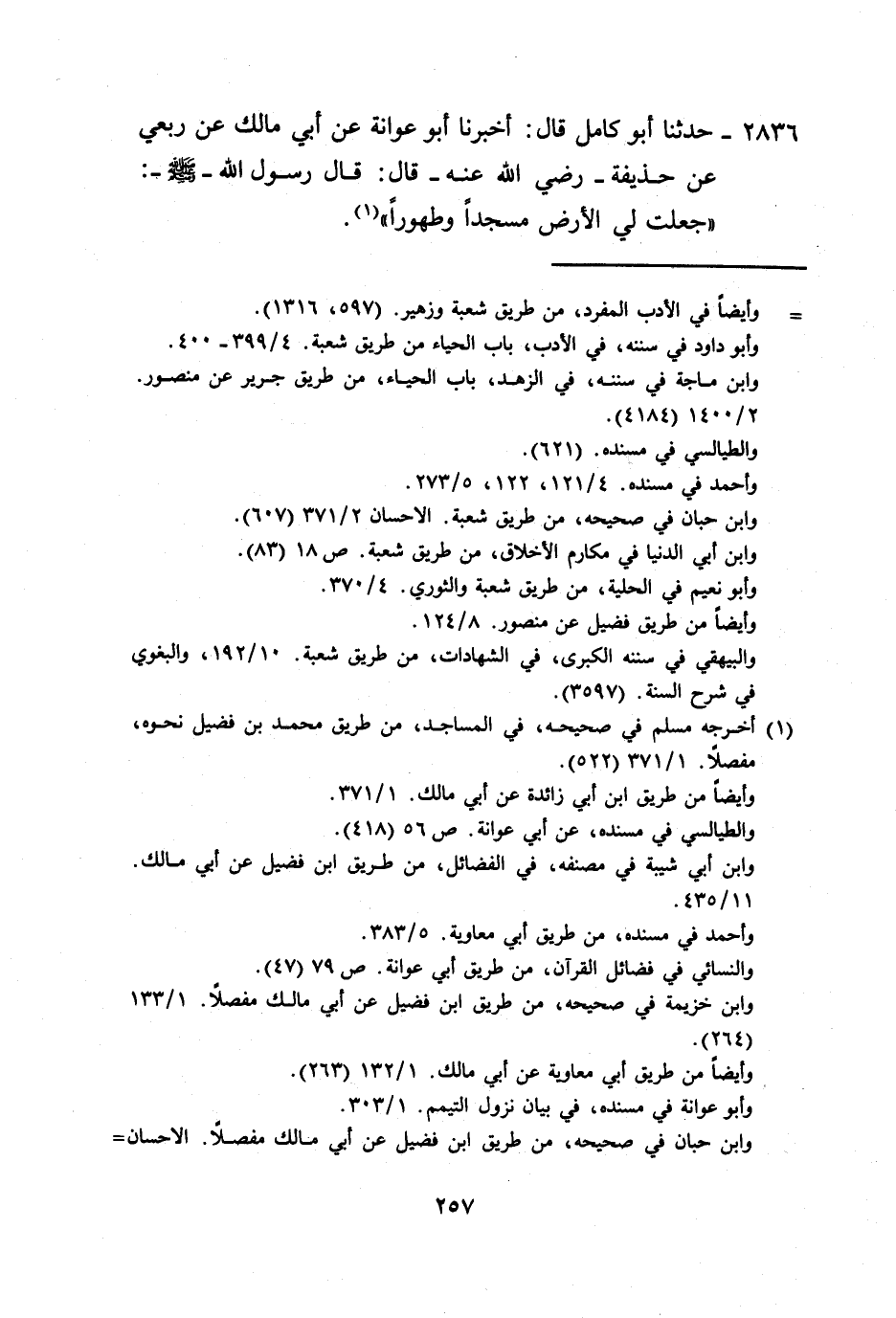 2836 - حَدَّثَنَا أَبُو كَامِلٍ، قَالَ: أَخْبَرَنَا أَبُو عَوَانَةَ، عَنْ أَبِي مَالِكٍ، عَنْ رِبْعِيٍّ، عَنْ حُذَيْفَةَ رَضِيَ اللَّهُ عَنْهُ قَالَ: قَالَ رَسُولُ اللَّهِ صَلَّى اللهُ عَلَيْهِ وَسَلَّمَ: «§جُعِلَتْ لِيَ الْأَرْضُ مَسْجِدًا، وَطَهُورًا» -[258]- وَهَذَا الْحَدِيثُ لَا نَعْلَمُهُ يُرْوَى عَنْ حُذَيْفَةَ إِلَّا بِهَذَا الْإِسْنَادِ
