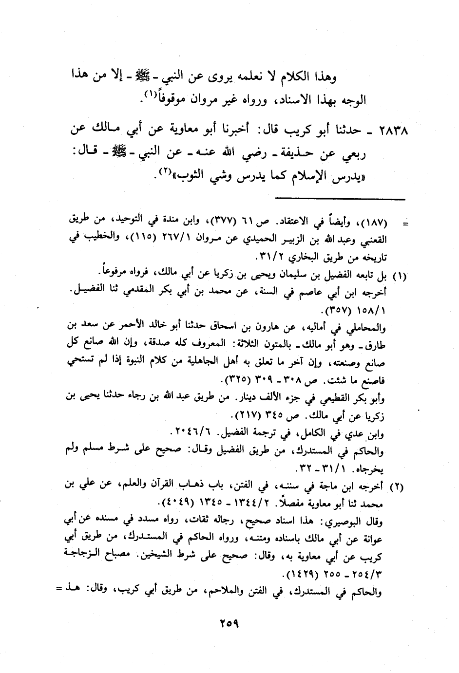 2838 - حَدَّثَنَا أَبُو كُرَيْبٍ، قَالَ: أَخْبَرَنَا أَبُو مُعَاوِيَةَ، عَنْ أَبِي مَالِكٍ، عَنْ رِبْعِيٍّ، عَنْ حُذَيْفَةَ رَضِيَ اللَّهُ عَنْهُ، عَنِ النَّبِيِّ صَلَّى اللهُ عَلَيْهِ وَسَلَّمَ قَالَ: «§يَدْرُسُ الْإِسْلَامُ كَمَا يَدْرُسُ، وَشْيُ الثَّوْبِ» -[260]- وَهَذَا الْحَدِيثُ قَدْ رَوَاهُ جَمَاعَةٌ عَنْ أَبِي مَالِكٍ، عَنْ رِبْعِيٍّ، عَنْ حُذَيْفَةَ مَوْقُوفًا، وَلَا نَعْلَمُ أَحَدًا أَسْنَدَهُ إِلَّا أَبُو كُرَيْبٍ، عَنْ أَبِي مُعَاوِيَةَ.