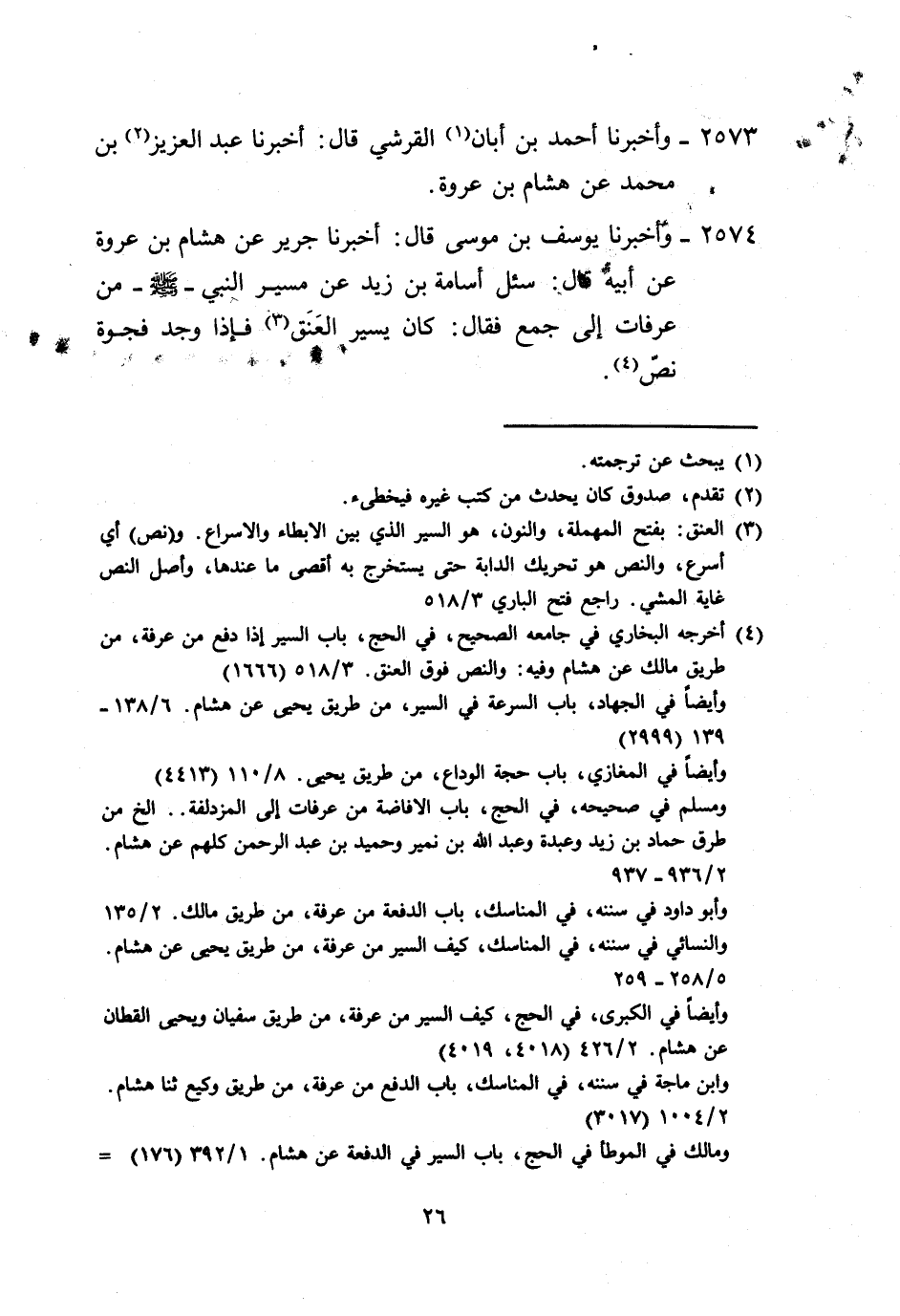 2574 - وَأَخْبَرَنَا يُوسُفُ بْنُ مُوسَى، قَالَ: أَخْبَرَنَا جَرِيرٌ، عَنْ هِشَامِ بْنِ عُرْوَةَ، عَنْ أَبِيهِ، قَالَ: سُئِلَ أُسَامَةُ بْنُ زَيْدٍ، عَنْ مَسِيرِ النَّبِيِّ صَلَّى اللهُ عَلَيْهِ وَسَلَّمَ مِنْ عَرَفَاتٍ إِلَى جَمْعٍ فَقَالَ: «كَانَ §يَسِيرُ الْعَنَقَ فَإِذَا وَجَدَ فَجْوَةً نَصَّ» -[27]- وَهَذَا الْحَدِيثُ لَا نَعْلَمُهُ يُرْوَى بِهَذَا اللَّفْظِ إِلَّا عَنْ أُسَامَةَ بِهَذَا الْإِسْنَادِ، وَقَدْ رَوَاهُ غَيْرُ وَاحِدٍ عَنْ هِشَامِ بْنِ عُرْوَةَ، عَنْ أُسَامَةَ