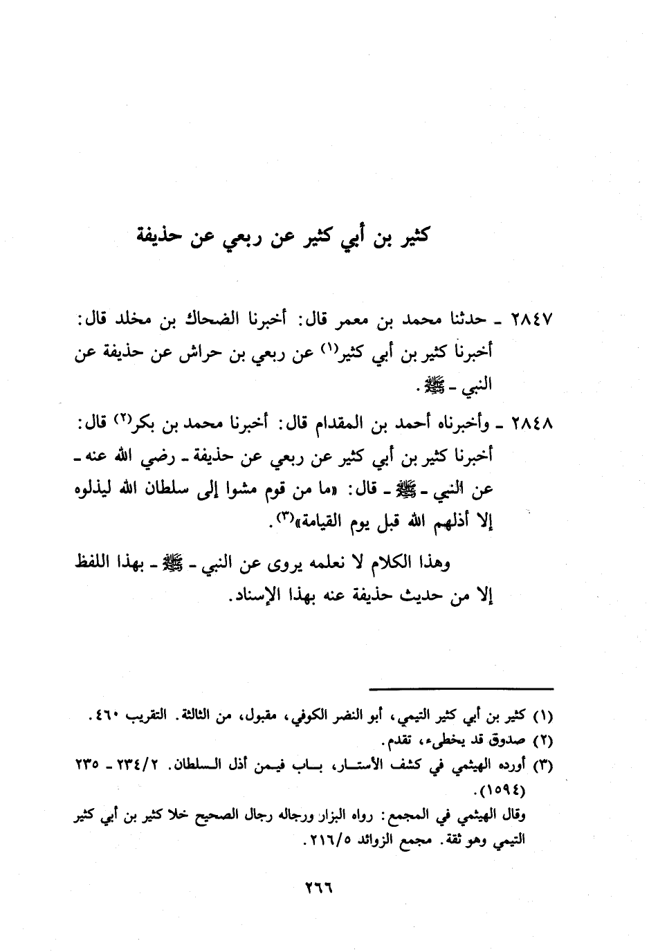 2847 - حَدَّثَنَا مُحَمَّدُ بْنُ مَعْمَرٍ، قَالَ: أَخْبَرَنَا الضَّحَّاكُ بْنُ مَخْلَدٍ، قَالَ: أَخْبَرَنَا كَثِيرُ بْنُ أَبِي كَثِيرٍ، عَنْ رِبْعِيِّ بْنِ حِرَاشٍ، عَنْ حُذَيْفَةَ، عَنِ النَّبِيِّ صَلَّى اللهُ عَلَيْهِ وَسَلَّمَ.