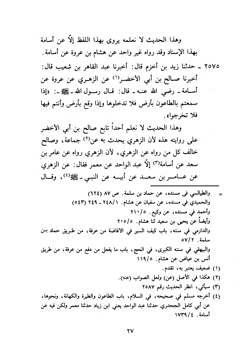 2575 - حَدَّثَنَا زَيْدُ بْنُ أَخْزَمَ، قَالَ: أَخْبَرَنَا عَبْدُ الْقَاهِرِ بْنُ شُعَيْبٍ، قَالَ: أَخْبَرَنَا صَالِحُ بْنُ أَبِي الْأَخْضَرِ، عَنِ الزُّهْرِيِّ، عَنْ عُرْوَةَ، عَنْ أُسَامَةَ رَضِيَ اللَّهُ عَنْهُ قَالَ: قَالَ رَسُولُ اللَّهِ صَلَّى اللهُ عَلَيْهِ وَسَلَّمَ: «§إِذَا سَمِعْتُمْ بِالطَّاعُونِ بِأَرْضٍ فَلَا تَدْخُلُوهَا، وَإِذَا وَقَعَ بِأَرْضٍ وَأَنْتُمْ فِيهَا فَلَا تَخْرُجُوا» وَهَذَا الْحَدِيثُ لَا نَعْلَمُ أَحَدًا تَابَعَ صَالِحَ بْنَ أَبِي الْأَخْضَرِ عَلَى رِوَايَتِهِ هَذِهِ؛ لِأَنَّ الزُّهْرِيَّ يُحَدِّثُ بِهِ عَنْ جَمَاعَةٍ، وَصَالِحٌ خَالَفَ كُلَّ مَنْ رَوَاهُ، عَنِ الزُّهْرِيِّ؛ لِأَنَّ الزُّهْرِيَّ رَوَاهُ، عَنْ عَامِرِ بْنِ سَعْدٍ، عَنْ أُسَامَةَ إِلَّا عَبْدُ الْوَاحِدِ، عَنْ مَعْمَرٍ، فَقَالَ: عَنِ الزُّهْرِيِّ، عَنْ عَامِرِ بْنِ سَعْدٍ، عَنْ أَبِيهِ، عَنِ النَّبِيِّ صَلَّى اللهُ عَلَيْهِ وَسَلَّمَ، وَقَالَ -[28]- عَبْدُ الرَّحْمَنِ بْنُ إِسْحَاقَ، عَنِ الزُّهْرِيِّ، عَنْ عَامِرِ بْنِ سَعْدٍ، عَنْ زَيْدِ بْنِ ثَابِتٍ