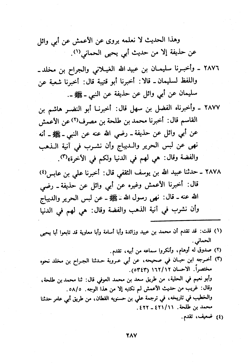 2877 - وَأَخْبَرَنَاهُ الْفَضْلُ بْنُ سَهْلٍ، قَالَ: أَخْبَرَنَا أَبُو النَّضْرِ هَاشِمُ بْنُ الْقَاسِمِ، قَالَ: أَخْبَرَنَا مُحَمَّدُ بْنُ طَلْحَةَ بْنِ مُصَرِّفٍ، عَنِ الْأَعْمَشِ، عَنْ أَبِي وَائِلٍ، عَنْ حُذَيْفَةَ رَضِيَ اللَّهُ عَنْهُ، عَنِ النَّبِيِّ صَلَّى اللهُ عَلَيْهِ وَسَلَّمَ أَنَّهُ: " §نَهَى عَنْ لُبْسِ الْحَرِيرِ، وَالدِّيبَاجِ، وَأَنْ نَشْرَبَ فِي آنِيَةِ الذَّهَبِ وَالْفِضَّةِ، وَقَالَ: «هِيَ لَهُمْ فِي الدُّنْيَا، وَلَكُمْ فِي الْآخِرَةِ»