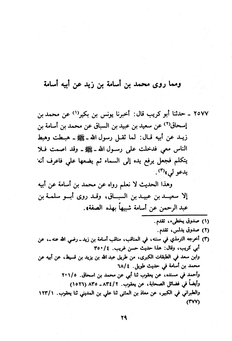 2577 - حَدَّثَنَا أَبُو كُرَيْبٍ، قَالَ: أَخْبَرَنَا يُونُسُ بْنُ بُكَيْرٍ، عَنْ مُحَمَّدِ بْنِ إِسْحَاقَ، عَنْ سَعِيدِ بْنِ عُبَيْدِ بْنِ السَّبَّاقِ، عَنْ مُحَمَّدِ بْنِ أُسَامَةَ بْنِ زَيْدٍ، عَنْ أَبِيهِ، قَالَ: «لَمَّا ثَقُلَ رَسُولُ اللَّهِ صَلَّى اللهُ عَلَيْهِ وَسَلَّمَ، هَبَطْتُ، وَهَبَطَ النَّاسُ مَعِي، §فَدَخَلْتُ عَلَى رَسُولِ اللَّهِ صَلَّى اللهُ عَلَيْهِ وَسَلَّمَ، وَقَدْ أُصْمِتَ فَلَا يَتَكَلَّمُ فَجَعَلَ يَرْفَعُ يَدَهُ إِلَى السَّمَاءِ، ثُمَّ يَضَعُهَا عَلَيَّ فَأَعْرِفُ أَنَّهُ يَدْعُو لِي» وَهَذَا الْحَدِيثُ لَا نَعْلَمُ رَوَاهُ عَنْ مُحَمَّدِ بْنِ أُسَامَةَ، عَنْ أَبِيهِ إِلَّا سَعِيدُ بْنُ عُبَيْدِ بْنِ السَّبَّاقِ، وَقَدْ رَوَى أَبُو سَلَمَةَ بْنُ عَبْدِ الرَّحْمَنِ، عَنْ أُسَامَةَ شَبِيهًا بِهَذِهِ الصِّفَةِ -[30]-.