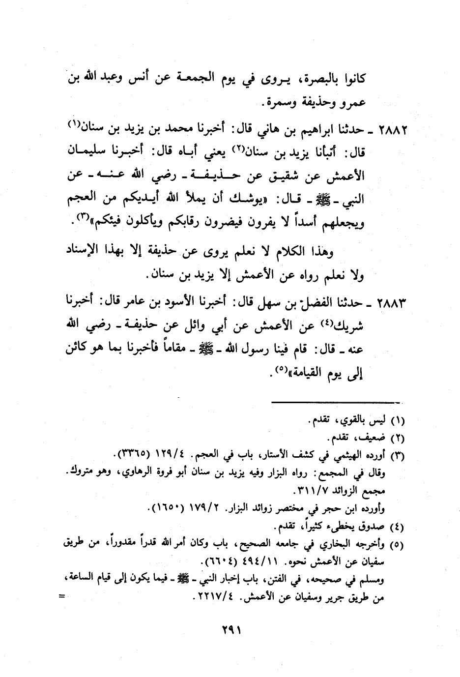 2882 - حَدَّثَنَا إِبْرَاهِيمُ بْنُ هَانِي، قَالَ: أَخْبَرَنَا مُحَمَّدُ بْنُ يَزِيدَ بْنِ سِنَانٍ، قَالَ: أَنْبَأَنَا يَزِيدُ بْنُ سِنَانٍ يَعْنِي أَبَاهُ، قَالَ: أَخْبَرَنَا سُلَيْمَانُ الْأَعْمَشُ، عَنْ شَقِيقٍ، عَنْ حُذَيْفَةَ رَضِيَ اللَّهُ عَنْهُ، عَنِ النَّبِيِّ صَلَّى اللهُ عَلَيْهِ وَسَلَّمَ قَالَ: «§يُوشِكُ أَنْ يَمْلَأَ اللَّهُ أَيْدِيَكُمْ مِنَ الْعَجَمِ وَيَجْعَلَهُمْ أُسْدًا لَا يَفِرُّونَ فَيَضْرِبُونَ رِقَابَكُمْ، وَيَأْكُلُونَ فَيْئَكُمْ» وَهَذَا الْكَلَامُ لَا نَعْلَمُ يُرْوَى عَنْ حُذَيْفَةَ إِلَّا بِهَذَا الْإِسْنَادِ، وَلَا نَعْلَمُ رَوَاهُ، عَنِ الْأَعْمَشِ إِلَّا يَزِيدُ بْنُ سِنَانٍ