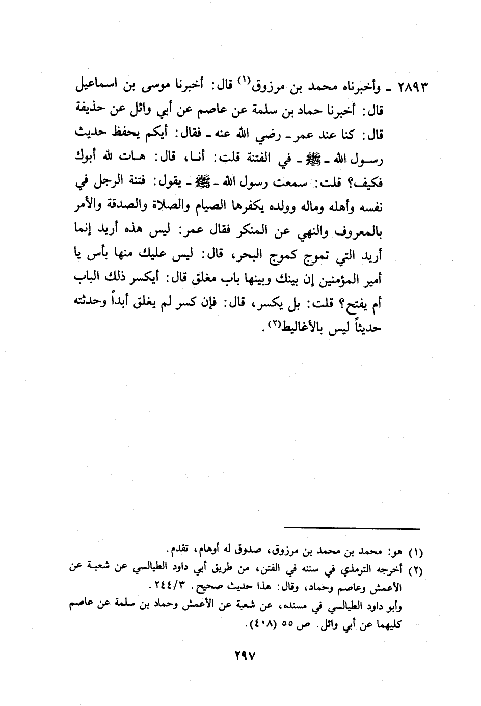 2893 - وَأَخْبَرَنَاهُ مُحَمَّدُ بْنُ مَرْزُوقٍ، قَالَ: أَخْبَرَنَا مُوسَى بْنُ إِسْمَاعِيلَ، قَالَ: أَخْبَرَنَا حَمَّادُ بْنُ سَلَمَةَ، عَنْ عَاصِمٍ، عَنْ أَبِي وَائِلٍ، عَنْ حُذَيْفَةَ، قَالَ: كُنَّا عِنْدَ عُمَرَ رَضِيَ اللَّهُ عَنْهُ فَقَالَ: أَيُّكُمْ يَحْفَظُ حَدِيثَ رَسُولِ اللَّهِ صَلَّى اللهُ عَلَيْهِ وَسَلَّمَ فِي الْفِتْنَةِ؟، قُلْتُ: أَنَا، قَالَ: هَاتِ لِلَّهِ أَبُوكَ فَكَيْفَ؟، قُلْتُ: سَمِعْتُ رَسُولَ اللَّهِ صَلَّى اللهُ عَلَيْهِ وَسَلَّمَ يَقُولُ: «§فِتْنَةُ الرَّجُلِ فِي نَفْسِهِ، وَأَهْلِهِ، وَمَالِهِ وَوَلَدِهِ يُكَفِّرُهَا الصِّيَامُ، وَالصَّلَاةُ، وَالصَّدَقَةُ، وَالْأَمْرُ بِالْمَعْرُوفِ، وَالنَّهْيُ عَنِ الْمُنْكَرِ» ، فَقَالَ عُمَرُ: لَيْسَ هَذِهِ أُرِيدُ إِنَّمَا أُرِيدُ الَّتِي تَمُوجُ كَمَوْجِ الْبَحْرِ قَالَ: لَيْسَ عَلَيْكَ مِنْهَا بَأْسٌ يَا أَمِيرَ الْمُؤْمِنِينَ إِنَّ بَيْنَكَ، وَبَيْنَهَا بَابًا مُغْلَقًا، قَالَ: أَيُكْسَرُ ذَلِكَ الْبَابُ أَمْ يُفْتَحُ؟، قُلْتُ: بَلْ يُكْسَرُ، قَالَ: فَإِنْ كُسِرَ لَمْ يُغْلَقْ أَبَدًا، وَحَدَّثْتُهُ حَدِيثًا لَيْسَ بِالْأَغَالِيطِ