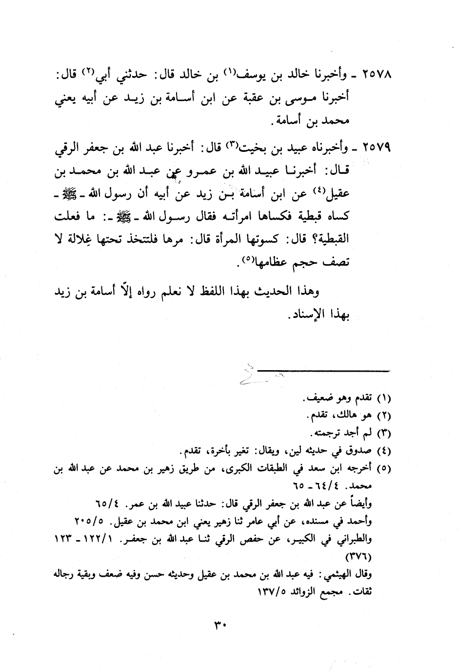 2579 - وَأَخْبَرَنَاهُ عُبَيْدُ بْنُ بُخَيتٍ، قَالَ: أَخْبَرَنَا عَبْدُ اللَّهِ بْنُ جَعْفَرٍ الرَّقِّيُّ، قَالَ: أَخْبَرَنَا عُبَيْدُ اللَّهِ بْنُ عَمْرٍو، عَنْ عَبْدِ اللَّهِ بْنِ مُحَمَّدِ بْنِ عَقِيلٍ، عَنِ ابْنِ أُسَامَةَ بْنِ زَيْدٍ، عَنْ أَبِيهِ: أَنَّ رَسُولَ اللَّهِ صَلَّى اللهُ عَلَيْهِ وَسَلَّمَ كَسَاهُ قُبْطِيَّةً فَكَسَاهَا امْرَأَتَهُ، فَقَالَ رَسُولُ اللَّهِ صَلَّى اللهُ عَلَيْهِ وَسَلَّمَ: «§مَا فَعَلْتَ بِالْقُبْطِيَّةِ؟» ، قَالَ: كَسَوْتُهَا الْمَرْأَةَ، قَالَ: «مُرْهَا فَلْتَتَّخِذْ تَحْتَهَا غِلَالَةً لَا تَصِفُ حَجْمَ عِظَامِهَا» وَهَذَا الْحَدِيثُ بِهَذَا اللَّفْظِ لَا نَعْلَمُ رَوَاهُ إِلَّا أُسَامَةُ بْنُ زَيْدٍ بِهَذَا الْإِسْنَادِ