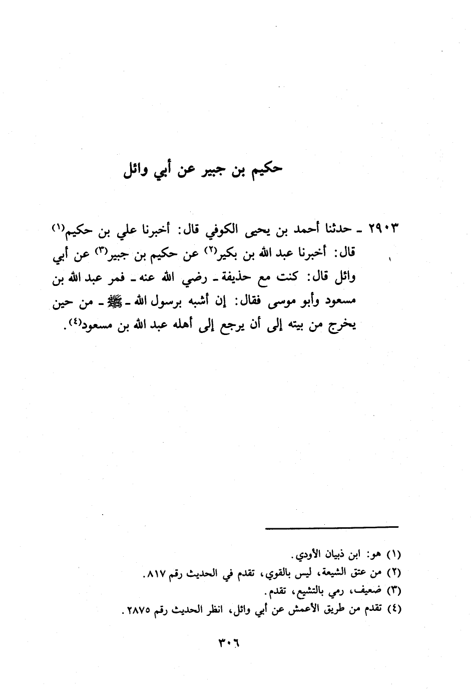 2903 - حَدَّثَنَا أَحْمَدُ بْنُ يَحْيَى الْكُوفِيُّ، قَالَ: أَخْبَرَنَا عَلِيُّ بْنُ حَكِيمٍ، قَالَ: أَخْبَرَنَا عَبْدُ اللَّهِ بْنُ بُكَيْرٍ، عَنْ حَكِيمِ بْنِ جُبَيْرٍ، عَنْ أَبِي وَائِلٍ، قَالَ: كُنْتُ مَعَ حُذَيْفَةَ رَضِيَ اللَّهُ عَنْهُ فَمَرَّ عَبْدُ اللَّهِ بْنُ مَسْعُودٍ، وَأَبُو مُوسَى فَقَالَ: «§إِنَّ أَشْبَهَ بِرَسُولِ اللَّهِ مِنْ حِينَ يَخْرُجُ مِنْ بَيْتِهِ، إِلَى أَنْ يَرْجِعَ إِلَى أَهْلِهِ عَبْدُ اللَّهِ بْنُ مَسْعُودٍ»