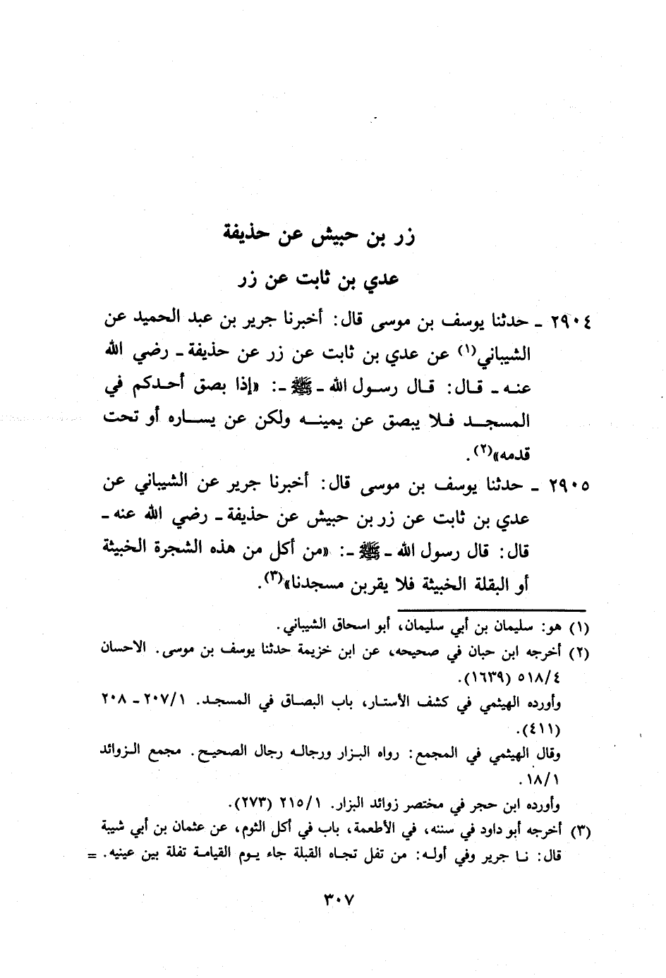 2905 - حَدَّثَنَا يُوسُفُ بْنُ مُوسَى، قَالَ: أَخْبَرَنَا جَرِيرٌ، عَنِ الشَّيْبَانِيِّ، عَنْ عَدِيِّ بْنِ ثَابِتٍ، عَنْ زِرِّ بْنِ حُبَيْشٍ، عَنْ حُذَيْفَةَ رَضِيَ اللَّهُ عَنْهُ قَالَ: قَالَ رَسُولُ اللَّهِ صَلَّى اللهُ عَلَيْهِ وَسَلَّمَ: «§مَنْ أَكَلَ مِنْ هَذِهِ الشَّجَرَةِ الْخَبِيثَةِ أَوِ الْبَقْلَةِ الْخَبِيثَةِ فَلَا يَقْرَبَنَّ مَسْجِدَنَا» -[308]- وَهَذَانِ الْحَدِيثَانِ لَا نَعْلَمُهُمَا يُرْوَيَانِ عَنْ حُذَيْفَةَ إِلَّا بِهَذَا الْإِسْنَادِ، وَلَا نَعْلَمُ أَسْنَدَهُمَا عَنِ الشَّيْبَانِيِّ إِلَّا جَرِيرٌ، وَرَوَاهُمَا غَيْرُ جَرِيرٍ مَوْقُوفَيْنِ