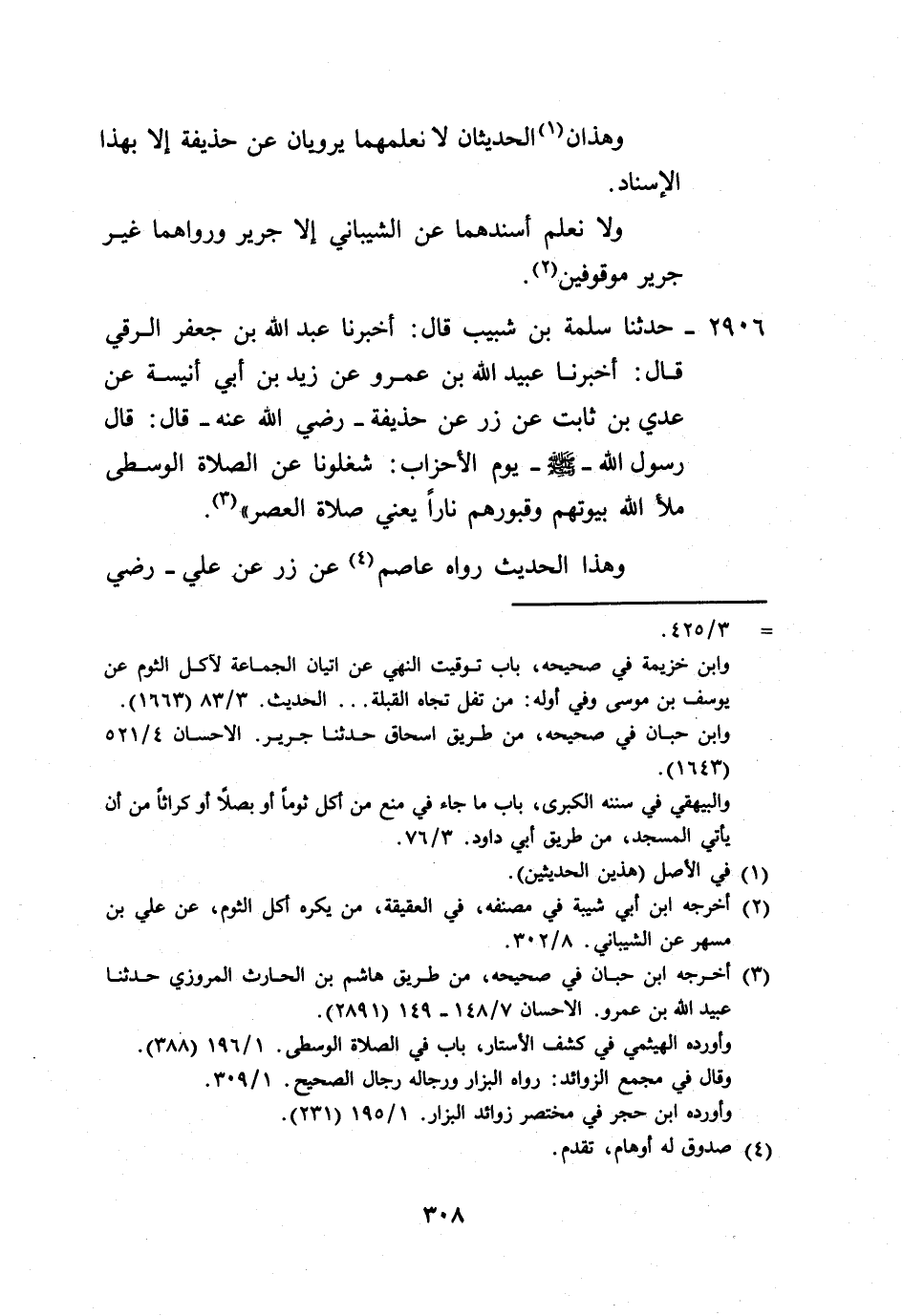2906 - حَدَّثَنَا سَلَمَةُ بْنُ شَبِيبٍ، قَالَ: أَخْبَرَنَا عَبْدُ اللَّهِ بْنُ جَعْفَرٍ الرَّقِّيُّ، قَالَ: أَخْبَرَنَا عُبَيْدُ اللَّهِ بْنُ عَمْرٍو، عَنْ زَيْدِ بْنِ أَبِي أُنَيْسَةَ، عَنْ عَدِيِّ بْنِ ثَابِتٍ، عَنْ زِرٍّ، عَنْ حُذَيْفَةَ رَضِيَ اللَّهُ عَنْهُ قَالَ: قَالَ رَسُولُ اللَّهِ صَلَّى اللهُ عَلَيْهِ وَسَلَّمَ يَوْمَ الْأَحْزَابِ: «§شَغَلُونَا عَنِ الصَّلَاةِ الْوُسْطَى، مَلَأَ اللَّهُ بُيُوتَهُمْ، وَقُبُورَهُمْ نَارًا» يَعْنِي صَلَاةَ الْعَصْرِ وَهَذَا الْحَدِيثُ رَوَاهُ عَاصِمٌ، عَنْ زِرٍّ، عَنْ عَلِيٍّ رَضِيَ -[309]- اللَّهُ عَنْهُ، وَقَالَ عَدِيٌّ: عَنْ زِرٍّ، عَنْ حُذَيْفَةَ