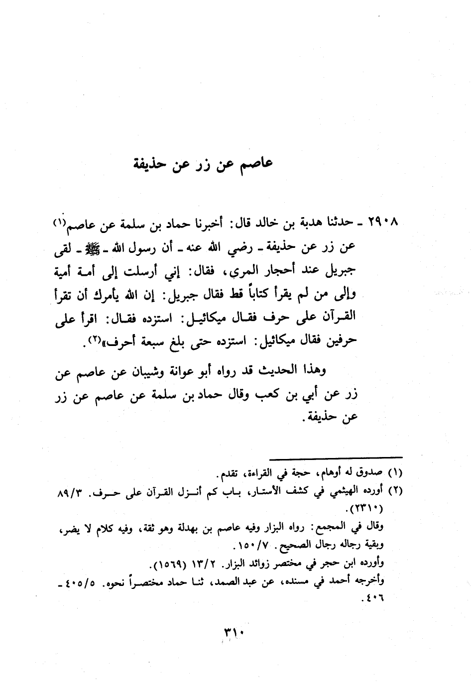 2908 - حَدَّثَنَا هُدْبَةُ بْنُ خَالِدٍ، قَالَ: أَخْبَرَنَا حَمَّادُ بْنُ سَلَمَةَ، عَنْ عَاصِمٍ، عَنْ زِرٍّ، عَنْ حُذَيْفَةَ رَضِيَ اللَّهُ عَنْهُ أَنَّ رَسُولَ اللَّهِ صَلَّى اللهُ عَلَيْهِ وَسَلَّمَ §لَقِيَ جِبْرِيلَ عِنْدَ أَحْجَارِ الْمُرِّيِّ "، فَقَالَ: " إِنِّي أُرْسِلْتُ إِلَى أُمَّةٍ أُمِّيَّةٍ، وَإِلَى مَنْ لَمْ يَقْرَأْ كِتَابًا قَطُّ، فَقَالَ جِبْرِيلُ: «إِنَّ اللَّهَ يَأْمُرُكَ أَنْ تَقْرَأَ الْقُرْآنَ عَلَى حَرْفٍ» ، فَقَالَ مِيكَائِيلُ: «اسْتَزِدْهُ» ، فَقَالَ: «اقْرَأْ عَلَى حَرْفَيْنِ» ، فَقَالَ مِيكَائِيلُ: «اسْتَزِدْهُ» : حَتَّى بَلَغَ سَبْعَةَ أَحْرُفٍ " وَهَذَا الْحَدِيثُ قَدْ رَوَاهُ أَبُو عَوَانَةَ، وَشَيْبَانُ، عَنْ عَاصِمٍ، عَنْ زِرٍّ، عَنْ أُبَيِّ بْنِ كَعْبٍ، وَقَالَ حَمَّادُ بْنُ سَلَمَةَ، عَنْ عَاصِمٍ، عَنْ زِرٍّ، عَنْ حُذَيْفَةَ -[311]-.