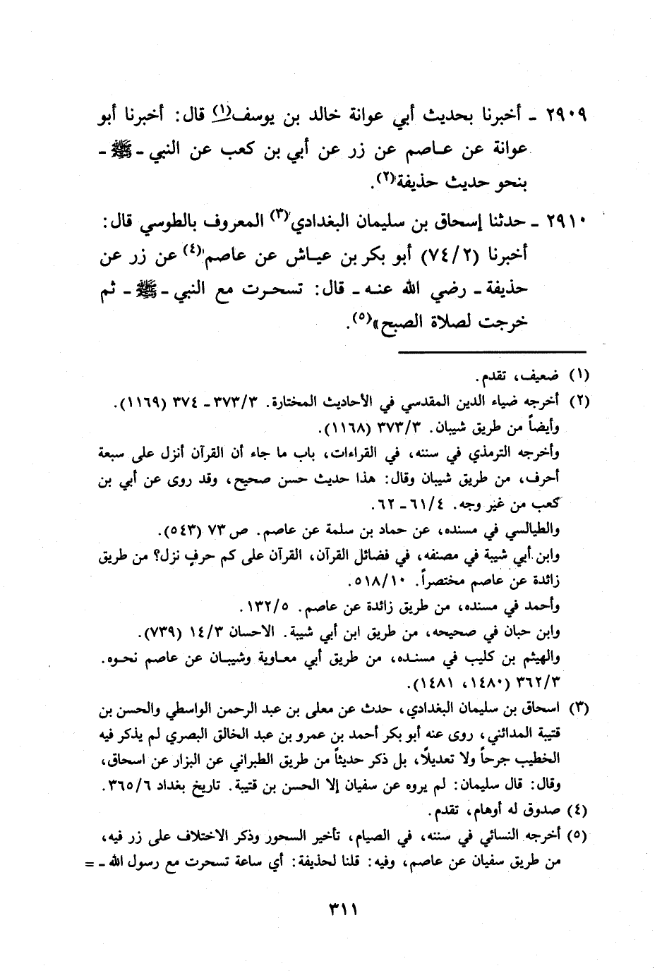 2910 - حَدَّثَنَا إِسْحَاقُ بْنُ سُلَيْمَانَ الْبَغْدَادِيُّ الْمَعْرُوفُ بِالطُّوسِيِّ، قَالَ: أَخْبَرَنَا أَبُو بَكْرِ بْنُ عَيَّاشٍ، عَنْ عَاصِمٍ، عَنْ زِرٍّ، عَنْ حُذَيْفَةَ رَضِيَ اللَّهُ عَنْهُ قَالَ: «§تَسَحَّرْتُ مَعَ النَّبِيِّ صَلَّى اللهُ عَلَيْهِ وَسَلَّمَ، ثُمَّ خَرَجْتُ لِصَلَاةِ الصُّبْحِ» -[312]- وَهَذَا الْحَدِيثُ لَا نَعْلَمُهُ يُرْوَى عَنْ حُذَيْفَةَ إِلَّا بِهَذَا الْإِسْنَادِ