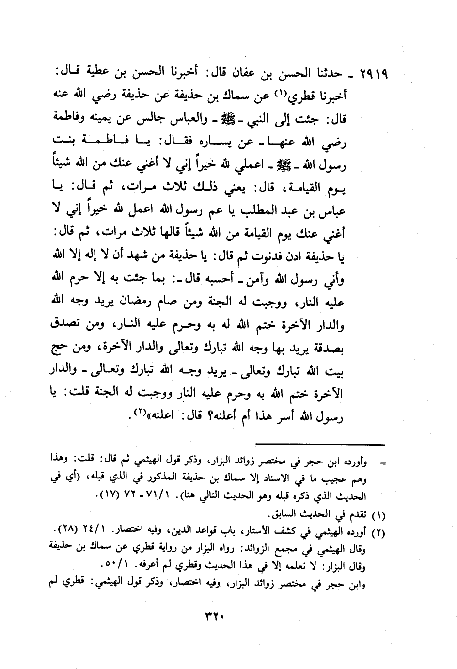 2919 - حَدَّثَنَا الْحَسَنُ بْنُ عَفَّانَ، قَالَ: أَخْبَرَنَا الْحَسَنُ بْنُ عَطِيَّةَ، قَالَ: أَخْبَرَنَا قَطَرِيٌّ، عَنْ سِمَاكِ بْنِ حُذَيْفَةَ، عَنْ حُذَيْفَةَ رَضِيَ اللَّهُ عَنْهُ قَالَ: جِئْتُ إِلَى النَّبِيِّ صَلَّى اللهُ عَلَيْهِ وَسَلَّمَ، وَالْعَبَّاسُ جَالِسٌ عَنْ يَمِينِهِ وَفَاطِمَةُ رَضِيَ اللَّهُ عَنْهَا عَنْ يَسَارِهِ فَقَالَ: «يَا فَاطِمَةُ بِنْتَ رَسُولِ اللَّهِ صَلَّى اللهُ عَلَيْهِ وَسَلَّمَ، اعْمَلِي لِلَّهِ خَيْرًا إِنِّي لَا أُغْنِي عَنْكِ مِنَ اللَّهِ شَيْئًا يَوْمَ الْقِيَامَةِ» ، قَالَ: يَعْنِي ذَلِكَ ثَلَاثَ مَرَّاتٍ، ثُمَّ قَالَ: «يَا عَبَّاسُ بْنَ عَبْدِ الْمُطَّلِبِ، يَا عَمَّ رَسُولِ اعْمَلْ لِلَّهِ خَيْرًا إِنِّي لَا أُغْنِي عَنْكَ يَوْمَ الْقِيَامَةِ مِنَ اللَّهِ شَيْئًا» ، قَالَهَا: ثَلَاثَ مَرَّاتٍ، ثُمَّ قَالَ: يَا حُذَيْفَةُ، ادْنُ، فَدَنَوْتُ، ثُمَّ قَالَ: «يَا حُذَيْفَةُ، §مَنْ شَهِدَ أَنْ لَا إِلَهَ إِلَّا اللَّهُ وَأَنِّي رَسُولُ اللَّهِ» ، وَآمَنَ أَحْسَبُهُ قَالَ: «بِمَا جِئْتُ بِهِ إِلَّا حَرَّمَ اللَّهُ عَلَيْهِ النَّارَ، وَوَجَبَتْ لَهُ الْجَنَّةُ، وَمَنَ صَامَ رَمَضَانَ يُرِيدُ وَجْهَ اللَّهِ، وَالدَّارَ الْآخِرَةِ خَتَمَ اللَّهُ لَهُ بِهِ وَحَرَّمَ عَلَيْهِ النَّارَ، وَمَنْ تَصَدَّقَ بِصَدَقَةٍ يُرِيدُ بِهَا وَجْهَ اللَّهِ تَبَارَكَ وَتَعَالَى، وَالدَّارَ الْآخِرَةَ، وَمَنْ حَجَّ بَيْتَ اللَّهِ تَبَارَكَ وَتَعَالَى يُرِيدُ وَجْهَ اللَّهِ تَبَارَكَ وَتَعَالَى، وَالدَّارَ الْآخِرَةَ خَتَمَ اللَّهُ بِهِ، وَحَرَّمَ عَلَيْهِ النَّارَ وَوَجَبَتْ لَهُ الْجَنَّةُ» ، قُلْتُ: يَا رَسُولَ اللَّهِ، أُسِرُّ هَذَا أَمْ أُعْلِنُهُ؟، قَالَ: «أَعْلِنْهُ» -[321]- وَهَذَانِ الْحَدِيثَانِ لَا نَعْلَمُهُمَا يُرْوَيَانِ عَنْ حُذَيْفَةَ إِلَّا بِهَذَا الْإِسْنَادِ، وَلَا نَعْلَمُ لِحُذَيْفَةَ ابْنًا يُقَالُ لَهُ: سِمَاكٌ إِلَّا فِي هَذَا الْحَدِيثِ