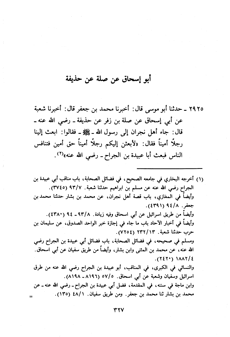 2925 - حَدَّثَنَا أَبُو مُوسَى، قَالَ: أَخْبَرَنَا مُحَمَّدُ بْنُ جَعْفَرٍ، قَالَ: أَخْبَرَنَا شُعْبَةُ، عَنْ أَبِي إِسْحَاقَ، عَنْ صِلَةَ بْنِ زُفَرَ، عَنْ حُذَيْفَةَ رَضِيَ اللَّهُ عَنْهُ قَالَ: جَاءَ أَهْلُ نَجْرَانَ إِلَى رَسُولِ اللَّهِ صَلَّى اللهُ عَلَيْهِ وَسَلَّمَ، فَقَالُوا: ابْعَثْ إِلَيْنَا رَجُلًا أَمِينًا، فَقَالَ: «§لَأَبْعَثَنَّ إِلَيْكُمْ رَجُلًا أَمِينًا حَقَّ أَمِينٍ» ، فَتَنَافَسَ النَّاسُ فَبَعَثَ أَبَا عُبَيْدَةَ بْنَ الْجَرَّاحٍ رَضِيَ اللَّهُ عَنْهُ " -[328]- وَهَذَا الْحَدِيثُ لَا نَعْلَمُهُ يُرْوَى عَنْ حُذَيْفَةَ إِلَّا بِهَذَا الْإِسْنَادِ