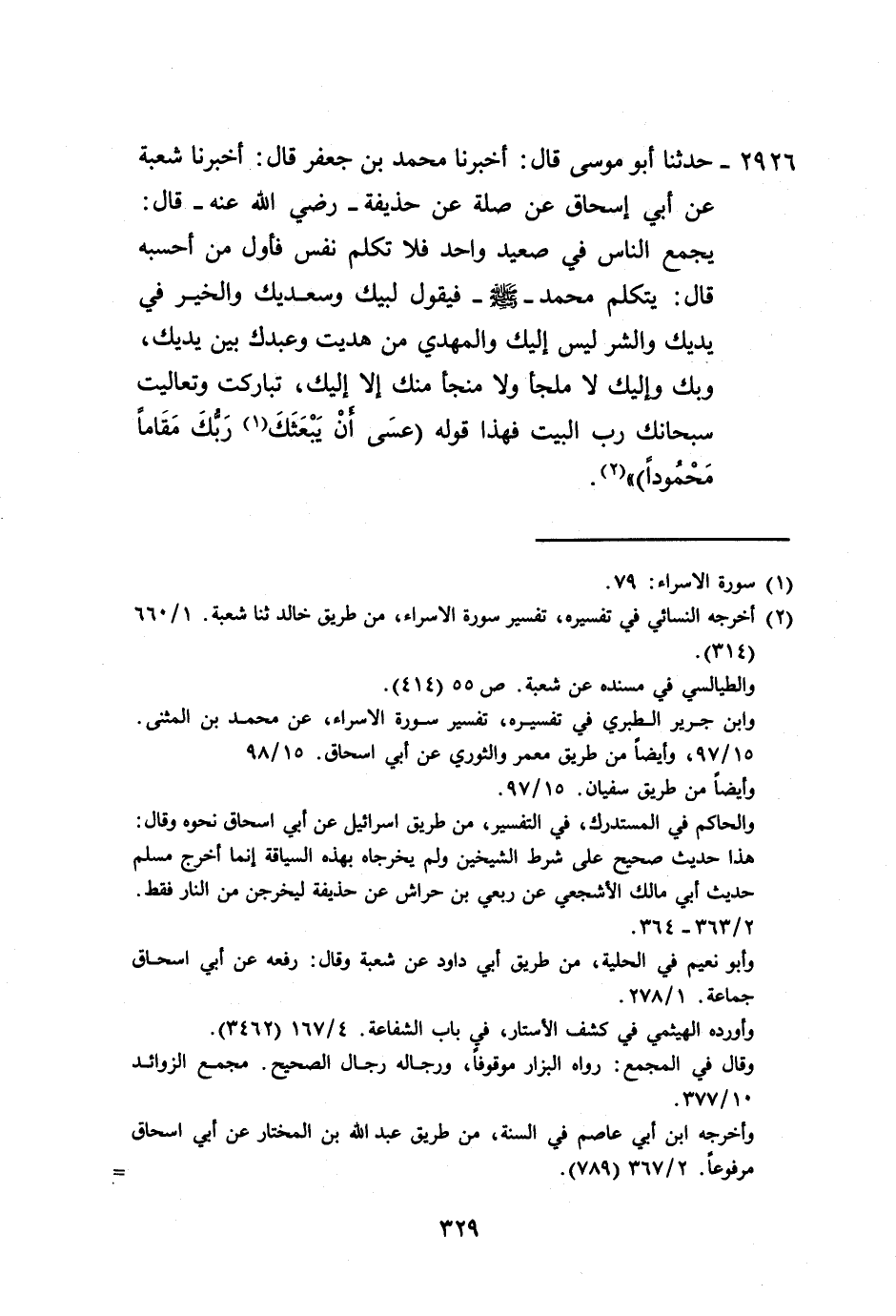 2926 - حَدَّثَنَا أَبُو مُوسَى، قَالَ: أَخْبَرَنَا مُحَمَّدُ بْنُ جَعْفَرٍ، قَالَ: أَخْبَرَنَا شُعْبَةُ، عَنْ أَبِي إِسْحَاقَ، عَنْ صِلَةَ، عَنْ حُذَيْفَةَ رَضِيَ اللَّهُ عَنْهُ قَالَ: يُجْمَعُ النَّاسُ فِي صَعِيدٍ وَاحِدٍ فَلَا تَكَلَّمُ نَفْسٌ، فَأَوَّلُ مَنْ أَحْسَبُهُ قَالَ: يَتَكَلَّمُ مُحَمَّدٌ صَلَّى اللهُ عَلَيْهِ وَسَلَّمَ، فَيَقُولُ: «§لَبَّيْكَ، وَسَعْدَيْكَ، وَالْخَيْرُ فِي يَدَيْكَ، وَالشَّرُّ لَيْسَ إِلَيْكَ، وَالْمَهْدِيُّ مَنْ هَدَيتَ، وَعَبْدُكَ بَيْنَ يَدَيْكَ، وَبِكَ وَإِلَيْكَ، لَا مَلْجَأَ وَلَا مَنْجَا مِنْكَ إِلَّا إِلَيْكَ تَبَارَكْتَ وَتَعَالَيتَ، سُبْحَانَكَ رَبَّ الْبَيْتِ» ، فَهَذَا قَوْلُهُ {عَسَى أَنْ يَبْعَثَكَ رَبُّكَ مَقَامًا مَحْمُودًا} [الإسراء: 79]