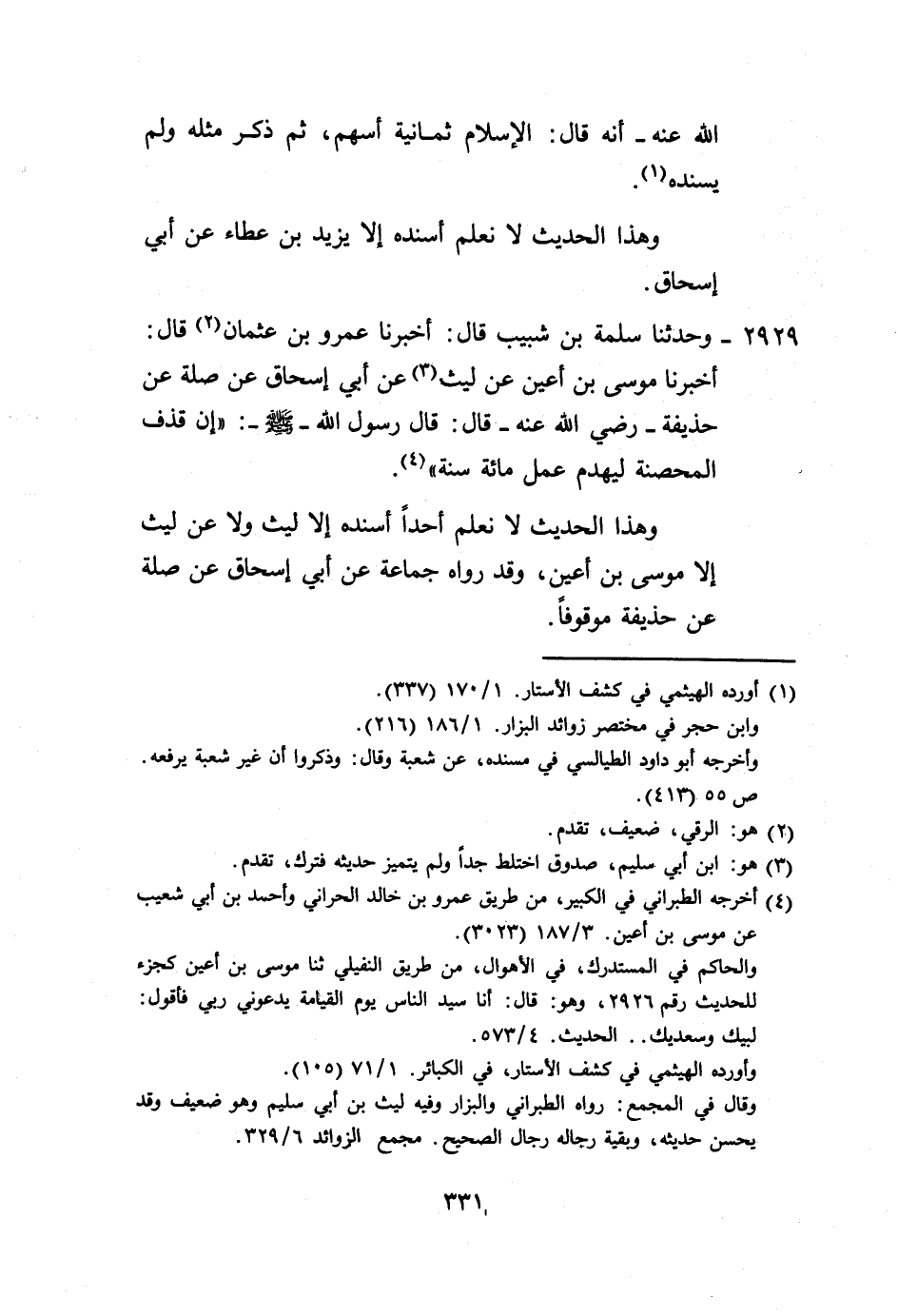 2929 - وَحَدَّثَنَا سَلَمَةُ بْنُ شَبِيبٍ، قَالَ: أَخْبَرَنَا عَمْرُو بْنُ عُثْمَانَ، قَالَ: أَخْبَرَنَا مُوسَى بْنُ أَعْيَنَ، عَنْ لَيْثٍ، عَنْ أَبِي إِسْحَاقَ، عَنْ صِلَةَ، عَنْ حُذَيْفَةَ رَضِيَ اللَّهُ عَنْهُ قَالَ: قَالَ رَسُولُ اللَّهِ صَلَّى اللهُ عَلَيْهِ وَسَلَّمَ: «إِنَّ §قَذْفَ الْمُحْصَنَةِ لَيَهْدِمُ عَمَلَ مِائَةِ سَنَةٍ» وَهَذَا الْحَدِيثُ لَا نَعْلَمُ أَحَدًا أَسْنَدَهُ إِلَّا لَيْثٌ، وَلَا عَنْ لَيْثٍ إِلَّا مُوسَى بْنُ أَعْيَنَ، وَقَدْ رَوَاهُ جَمَاعَةٌ، عَنْ أَبِي إِسْحَاقَ، عَنْ صِلَةَ، عَنْ حُذَيْفَةَ مَوْقُوفًا