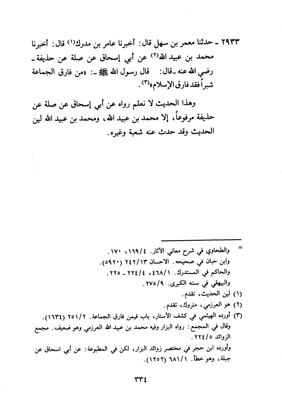 2933 - حَدَّثَنَا مَعْمَرُ بْنُ سَهْلٍ، قَالَ: أَخْبَرَنَا عَامِرُ بْنُ مُدْرِكٍ، قَالَ: أَخْبَرَنَا مُحَمَّدُ بْنُ عُبَيْدِ اللَّهِ، عَنْ أَبِي إِسْحَاقَ، عَنْ صِلَةَ، عَنْ حُذَيْفَةَ رَضِيَ اللَّهُ عَنْهُ قَالَ: قَالَ رَسُولُ اللَّهِ صَلَّى اللهُ عَلَيْهِ وَسَلَّمَ: «§مَنْ فَارَقَ الْجَمَاعَةَ شِبْرًا فَقَدْ فَارَقَ الْإِسْلَامَ» وَهَذَا الْحَدِيثُ لَا نَعْلَمُ رَوَاهُ عَنْ أَبِي إِسْحَاقَ، عَنْ صِلَةَ، عَنْ حُذَيْفَةَ مَرْفُوعًا إِلَّا مُحَمَّدُ بْنُ عُبَيْدِ اللَّهِ، وَمُحَمَّدُ بْنُ عُبَيْدِ اللَّهِ لَيِّنُ الْحَدِيثِ، وَقَدْ حَدَّثَ عَنْهُ شُعْبَةُ، وَغَيْرُهُ