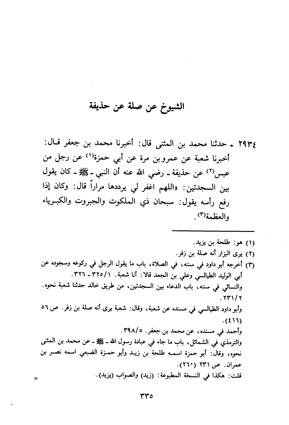 2934 - حَدَّثَنَا مُحَمَّدُ بْنُ الْمُثَنَّى، قَالَ: أَخْبَرَنَا مُحَمَّدُ بْنُ جَعْفَرٍ، قَالَ: أَخْبَرَنَا شُعْبَةُ، عَنْ عَمْرِو بْنِ مُرَّةَ، عَنْ أَبِي حَمْزَةَ، عَنْ رَجُلٍ، مِنْ عَبْسٍ، عَنْ حُذَيْفَةَ رَضِيَ اللَّهُ عَنْهُ أَنَّ النَّبِيَّ صَلَّى اللهُ عَلَيْهِ وَسَلَّمَ كَانَ يَقُولُ بَيْنَ السَّجْدَتَيْنِ: «§اللَّهُمَّ اغْفِرْ لِي» ، يُرَدِّدُهَا مِرَارًا، قَالَ: وَكَانَ إِذَا رَفَعَ رَأْسَهُ يَقُولُ: «سُبْحَانَ ذِي الْمَلَكُوتِ، وَالْجَبَرُوتِ، وَالْكِبْرِيَاءِ وَالْعَظَمَةِ»