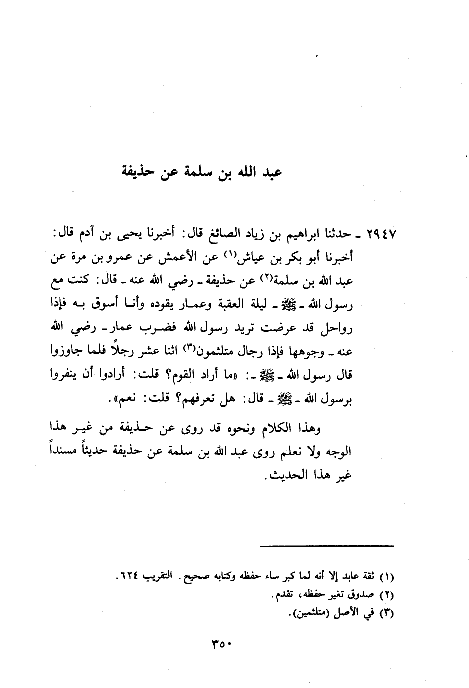 2947 - حَدَّثَنَا إِبْرَاهِيمُ بْنُ زِيَادٍ الصَّائِغُ، قَالَ: أَخْبَرَنَا يَحْيَى بْنُ آدَمَ، قَالَ: أَخْبَرَنَا أَبُو بَكْرِ بْنُ عَيَّاشٍ، عَنِ الْأَعْمَشِ، عَنْ عَمْرِو بْنِ مُرَّةَ، عَنْ عَبْدِ اللَّهِ بْنِ سَلَمَةَ، عَنْ حُذَيْفَةَ رَضِيَ اللَّهُ عَنْهُ قَالَ: كُنْتُ مَعَ رَسُولِ اللَّهِ صَلَّى اللهُ عَلَيْهِ وَسَلَّمَ، لَيْلَةَ الْعَقَبَةِ، وَعَمَّارٌ يَقُودُهُ، وَأَنَا أَسُوقُ بِهِ فَإِذَا رَوَاحِلُ قَدْ عَرَضَتْ تُرِيدُ رَسُولَ اللَّهِ فَضَرَبَ عَمَّارٌ رَضِيَ اللَّهُ عَنْهُ، وُجُوهَهَا فَإِذَا رِجَالٌ مُتَلَثِّمُونَ اثْنَا عَشَرَ رَجُلًا فَلَمَّا جَاوَزُوا، قَالَ رَسُولُ اللَّهِ صَلَّى اللهُ عَلَيْهِ وَسَلَّمَ: «§مَا أَرَادَ الْقَوْمُ؟» ، قُلْتُ: أَرَادُوا أَنْ يَنْفِرُوا بِرَسُولِ اللَّهِ صَلَّى اللهُ عَلَيْهِ وَسَلَّمَ، قَالَ: «هَلْ تَعْرِفُهُمْ؟» ، قُلْتُ: نَعَمْ وَهَذَا الْكَلَامُ وَنَحْوُهُ قَدْ رُوِيَ عَنْ حُذَيْفَةَ مِنْ غَيْرِ هَذَا الْوَجْهِ، وَلَا نَعْلَمُ رَوَى عَبْدُ اللَّهِ بْنُ سَلَمَةَ، عَنْ حُذَيْفَةَ حَدِيثًا مُسْنَدًا غَيْرَ هَذَا الْحَدِيثِ