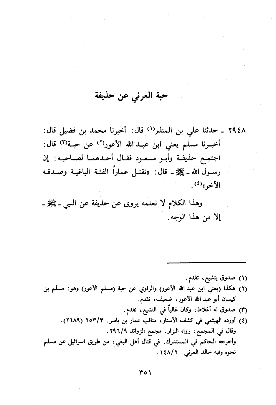 2948 - حَدَّثَنَا عَلِيُّ بْنُ الْمُنْذِرِ، قَالَ: أَخْبَرَنَا مُحَمَّدُ بْنُ فُضَيْلٍ، قَالَ: أَخْبَرَنَا مُسْلِمٌ يَعْنِي ابْنَ عَبْدِ اللَّهِ الْأَعْوَرَ، عَنْ حَبَّةَ، قَالَ: اجْتَمَعَ حُذَيْفَةُ، وَأَبُو مَسْعُودٍ، فَقَالَ أَحَدُهُمَا لِصَاحِبِهِ: إِنَّ رَسُولَ اللَّهِ صَلَّى اللهُ عَلَيْهِ وَسَلَّمَ قَالَ: «§تَقْتُلُ عَمَّارًا الْفِئَةُ الْبَاغِيَةُ» ، وَصَدَّقَهُ الْآخَرُ وَهَذَا الْكَلَامُ لَا نَعْلَمُهُ يُرْوَى عَنْ حُذَيْفَةَ عَنِ النَّبِيِّ صَلَّى اللهُ عَلَيْهِ وَسَلَّمَ إِلَّا مِنْ هَذَا الْوَجْهِ