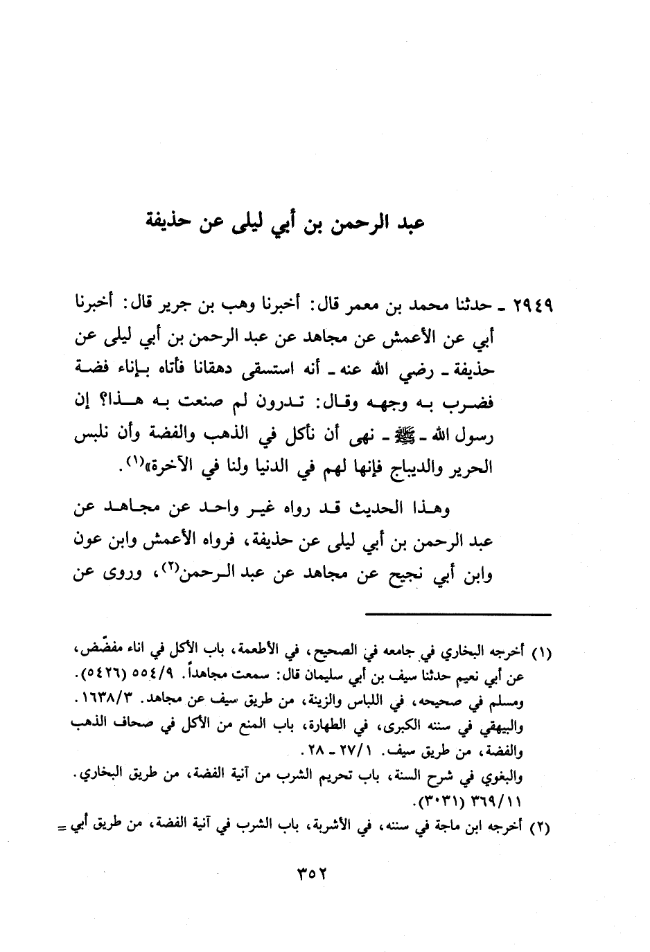 2949 - حَدَّثَنَا مُحَمَّدُ بْنُ مَعْمَرٍ، قَالَ: أَخْبَرَنَا وَهْبُ بْنُ جَرِيرٍ، قَالَ: أَخْبَرَنَا أَبِي، عَنِ الْأَعْمَشِ، عَنْ مُجَاهِدٍ، عَنْ عَبْدِ الرَّحْمَنِ بْنِ أَبِي لَيْلَى، عَنْ حُذَيْفَةَ رَضِيَ اللَّهُ عَنْهُ أَنَّهُ: اسْتَسْقَى دُهْقَانًا فَأَتَاهُ بِإِنَاءِ فِضَّةٍ فَضَرَبَ بِهِ وَجْهَهُ وَقَالَ: تَدْرُونَ لِمَ صَنَعْتُ بِهِ هَذَا؟، إِنَّ رَسُولَ اللَّهِ صَلَّى اللهُ عَلَيْهِ وَسَلَّمَ «§نَهَى أَنْ نَأْكُلَ فِي الذَّهَبِ، وَالْفِضَّةِ، وَأَنْ نَلْبَسَ الْحَرِيرَ، وَالدِّيبَاجَ فَإِنَّهَا لَهُمْ فِي الدُّنْيَا، وَلَنَا فِي الْآخِرَةِ» وَهَذَا الْحَدِيثُ قَدْ رَوَاهُ غَيْرُ وَاحِدٍ عَنْ مُجَاهِدٍ، عَنْ عَبْدِ الرَّحْمَنِ بْنِ أَبِي لَيْلَى، عَنْ حُذَيْفَةَ. فَرَوَاهُ الْأَعْمَشُ، وَابْنُ عَوْنٍ، وَابْنُ أَبِي نَجِيحٍ، عَنْ مُجَاهِدٍ، عَنْ عَبْدِ الرَّحْمَنِ، وَرُوِيَ عَنْ -[353]- عَبْدِ الرَّحْمَنِ بْنِ أَبِي لَيْلَى، مِنْ غَيْرِ وَجْهٍ فَرَوَاهُ الْحَكَمُ، وَيَزِيدُ بْنُ أَبِي زِيَادٍ، وَأَبُو فَرْوَةَ،