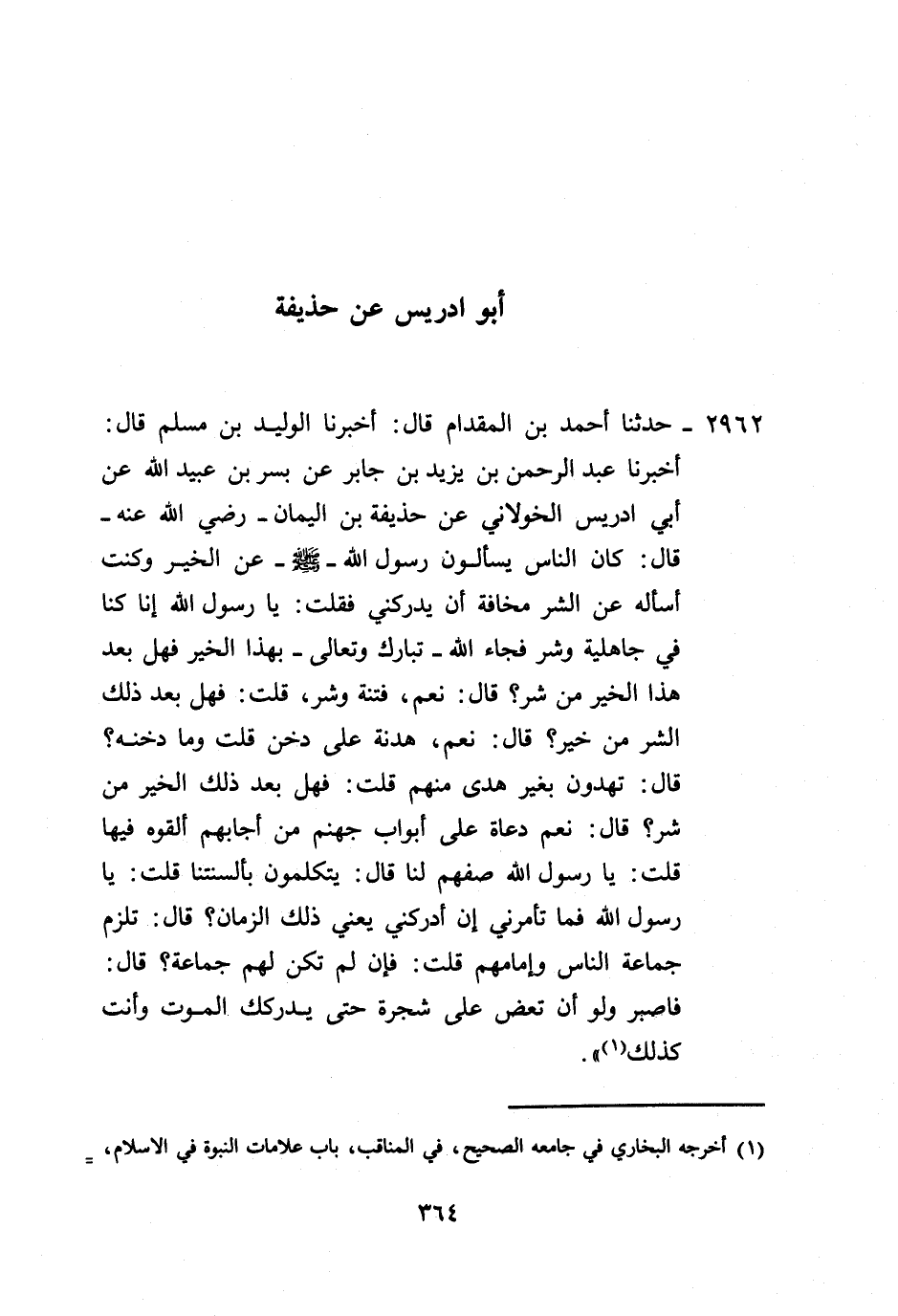 2962 - حَدَّثَنَا أَحْمَدُ بْنُ الْمِقْدَامِ، قَالَ: أَخْبَرَنَا الْوَلِيدُ بْنُ مُسْلِمٍ، قَالَ: أَخْبَرَنَا عَبْدُ الرَّحْمَنِ بْنُ يَزِيدَ بْنِ جَابِرٍ، عَنْ بُسْرِ بْنِ عُبَيْدِ اللَّهِ، عَنْ أَبِي إِدْرِيسَ الْخَوْلَانِيِّ، عَنْ حُذَيْفَةَ بْنِ الْيَمَانِ رَضِيَ اللَّهُ عَنْهُ قَالَ: كَانَ النَّاسُ يَسْأَلُونَ رَسُولَ اللَّهِ صَلَّى اللهُ عَلَيْهِ وَسَلَّمَ عَنِ الْخَيْرِ، وَكُنْتُ أَسْأَلُهُ عَنِ الشَّرِّ مَخَافَةَ أَنْ يُدْرِكَنِي، فَقُلْتُ: يَا رَسُولَ اللَّهِ، إِنَّا كُنَّا فِي جَاهِلِيَّةٍ، وَشَرٍّ فَجَاءَ اللَّهُ تَبَارَكَ وَتَعَالَى بِهَذَا الْخَيْرِ §فَهَلْ بَعْدَ هَذَا الْخَيْرِ مِنْ شَرٍّ؟، قَالَ: «نَعَمْ فِتْنَةٌ، وَشَرٌّ» قُلْتُ: فَهَلْ بَعْدَ ذَلِكَ الشَّرِّ مِنْ خَيْرٍ؟ قَالَ: «نَعَمْ، هُدْنَةٌ عَلَى دَخَنٍ» قُلْتُ: وَمَا دَخَنُهُ؟، قَالَ: «تُهْدَوْنَ بِغَيْرِ هُدًى مِنْهُمْ» ، قُلْتُ: فَهَلْ بَعْدَ ذَلِكَ الْخَيْرِ مِنْ شَرٍّ؟، قَالَ: «نَعَمْ، دُعَاةٌ عَلَى أَبْوَابِ جَهَنَّمَ مَنْ أَجَابَهُمْ أَلْقَوْهُ فِيهَا» ، قُلْتُ: يَا رَسُولَ اللَّهِ، صِفْهُمْ لَنَا، قَالَ: «يَتَكَلَّمُونَ بِأَلْسِنَتِنَا» ، قُلْتُ: يَا رَسُولَ اللَّهِ، فَمَا تَأْمُرُنِي إِنْ أَدْرَكَنِي؟، يَعْنِي: ذَلِكَ الزَّمَانُ قَالَ: «تَلْزَمُ جَمَاعَةَ النَّاسِ وَإِمَامَهُمْ» ، قُلْتُ: فَإِنْ لَمْ تَكُنْ لَهُمْ جَمَاعَةٌ؟، قَالَ: «فَاصْبِرْ، وَلَوْ أَنْ تَعَضَّ عَلَى شَجَرَةٍ حَتَّى يُدْرِكَكَ الْمَوْتُ، وَأَنْتَ كَذَلِكَ»