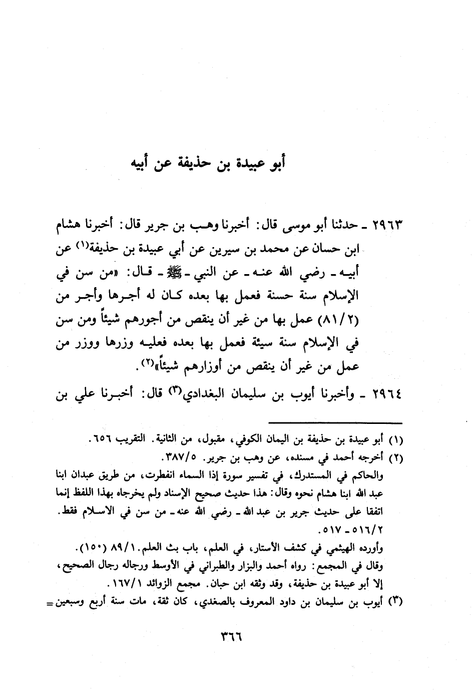 2963 - حَدَّثَنَا أَبُو مُوسَى، قَالَ: أَخْبَرَنَا وَهْبُ بْنُ جَرِيرٍ، قَالَ: أَخْبَرَنَا هِشَامُ بْنُ حَسَّانَ، عَنْ مُحَمَّدِ بْنِ سِيرِينَ، عَنْ أَبِي عُبَيْدَةَ بْنِ حُذَيْفَةَ، عَنْ أَبِيهِ رَضِيَ اللَّهُ عَنْهُ، عَنِ النَّبِيِّ صَلَّى اللهُ عَلَيْهِ وَسَلَّمَ قَالَ: «§مَنْ سَنَّ فِي الْإِسْلَامِ سُنَّةً حَسَنَةً فَعُمِلَ بِهَا بَعْدَهُ كَانَ لَهُ أَجْرُهَا، وَأَجْرُ مَنْ عَمِلَ بِهَا مِنْ غَيْرِ أَنْ يَنْقُصَ مِنْ أُجُورِهِمْ شَيْءٌ، وَمَنْ سَنَّ فِي الْإِسْلَامِ سُنَّةً سَيِّئَةً فَعُمِلَ بِهَا بَعْدَهُ فَعَلَيْهِ، وِزْرُهَا، وَوِزْرُ مَنْ عَمِلَ مِنْ غَيْرِ أَنْ يَنْقُصَ مِنْ أَوْزَارِهِمْ شَيْءٌ»