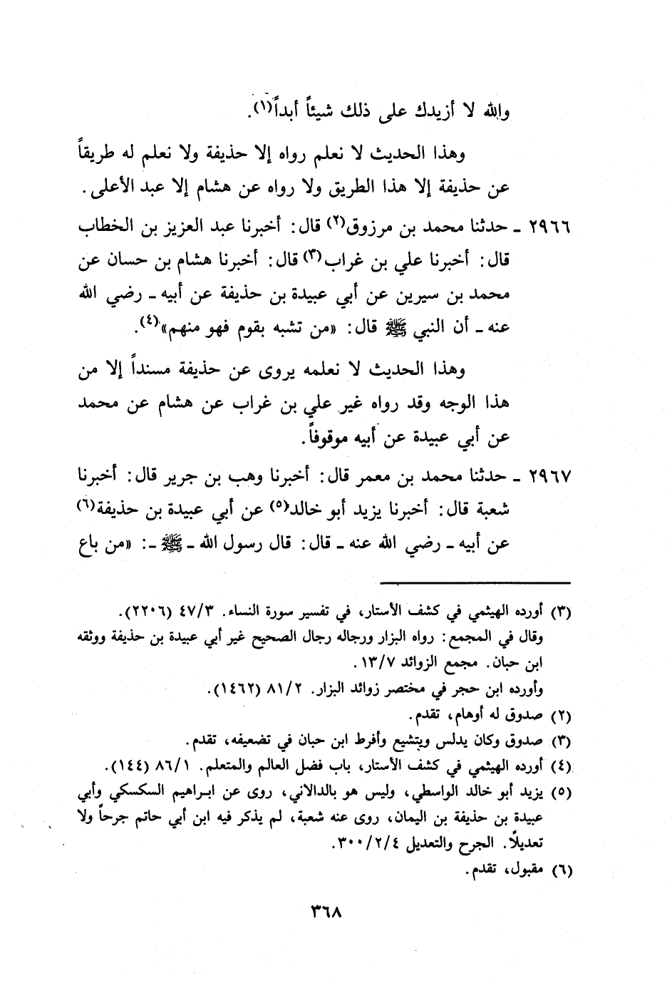 2966 - حَدَّثَنَا مُحَمَّدُ بْنُ مَرْزُوقٍ، قَالَ: أَخْبَرَنَا عَبْدُ الْعَزِيزِ بْنُ الْخَطَّابِ، قَالَ: أَخْبَرَنَا عَلِيُّ بْنُ غُرَابٍ، قَالَ: أَخْبَرَنَا هِشَامُ بْنُ حَسَّانَ، عَنْ مُحَمَّدِ بْنِ سِيرِينَ، عَنْ أَبِي عُبَيْدَةَ بْنِ حُذَيْفَةَ، عَنْ أَبِيهِ رَضِيَ اللَّهُ عَنْهُ أَنَّ النَّبِيَّ صَلَّى اللهُ عَلَيْهِ وَسَلَّمَ قَالَ: «§مَنْ تَشَبَّهَ بِقَوْمٍ فَهُوَ مِنْهُمْ» وَهَذَا الْحَدِيثُ لَا نَعْلَمُهُ يُرْوَى عَنْ حُذَيْفَةَ مُسْنَدًا إِلَّا مِنْ هَذَا الْوَجْهِ، وَقَدْ رَوَاهُ غَيْرُ عَلِيِّ بْنِ غُرَابٍ عَنْ هِشَامٍ، عَنْ مُحَمَّدٍ، عَنْ أَبِي عُبَيْدَةَ، عَنْ أَبِيهِ مَوْقُوفًا