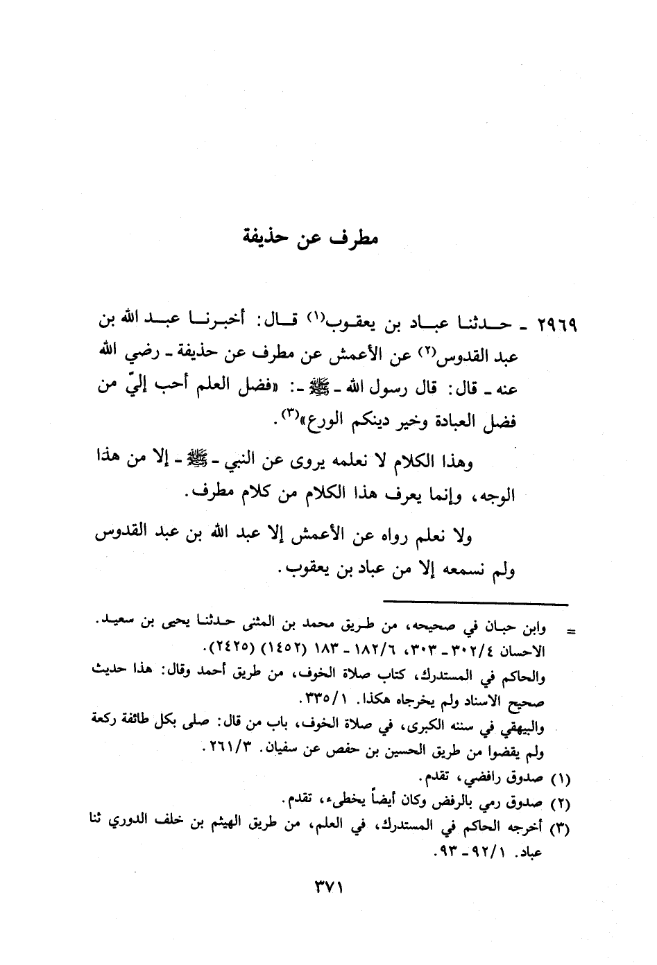 2969 - حَدَّثَنَا عَبَّادُ بْنُ يَعْقُوبَ، قَالَ: أَخْبَرَنَا عَبْدُ اللَّهِ بْنُ عَبْدِ الْقُدُّوسِ، عَنِ الْأَعْمَشِ، عَنْ مُطَرِّفٍ، عَنْ حُذَيْفَةَ رَضِيَ اللَّهُ عَنْهُ قَالَ: قَالَ رَسُولُ اللَّهِ صَلَّى اللهُ عَلَيْهِ وَسَلَّمَ: «§فَضْلُ الْعِلْمِ أَحَبُّ إِلَيَّ مِنْ فَضْلِ الْعِبَادَةِ، وَخَيْرُ دِينِكِمُ الْوَرَعُ» وَهَذَا الْكَلَامُ لَا نَعْلَمُهُ يُرْوَى عَنِ النَّبِيِّ صَلَّى اللهُ عَلَيْهِ وَسَلَّمَ إِلَّا مِنْ هَذَا الْوَجْهِ، وَإِنَّمَا يُعْرَفُ هَذَا الْكَلَامُ مِنْ كَلَامِ مُطَرِّفٍ، وَلَا نَعْلَمُ رَوَاهُ، عَنِ الْأَعْمَشِ إِلَّا عَبْدُ اللَّهِ بْنُ عَبْدِ الْقُدُّوسِ، وَلَمْ نَسْمَعْهُ إِلَّا مِنْ عَبَّادِ بْنِ يَعْقُوبَ