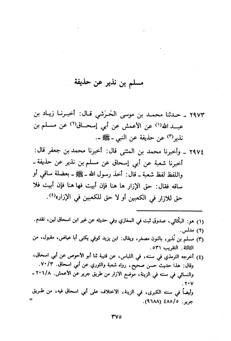 2974 - وَأَخْبَرَنَا مُحَمَّدُ بْنُ الْمُثَنَّى، قَالَ: أَخْبَرَنَا مُحَمَّدُ بْنُ جَعْفَرٍ، قَالَ: أَخْبَرَنَا شُعْبَةُ، عَنْ أَبِي إِسْحَاقَ، عَنْ مُسْلِمِ بْنِ نَذِيرٍ، عَنْ حُذَيْفَةَ وَاللَّفْظُ، لَفْظُ شُعْبَةَ قَالَ: أَخَذَ رَسُولُ اللَّهِ صَلَّى اللهُ عَلَيْهِ وَسَلَّمَ بِعَضَلَةِ سَاقِي أَوْ سَاقِهِ فَقَالَ: «§حَقُّ الْإِزَارِ هَاهُنَا، فَإِنْ أَبَيْتَ فَهَاهُنَا، فَإِنْ أَبَيْتَ فَلَا حَقَّ لِلِإِزَارِ فِي الْكَعْبَيْنِ أَوْ لَا حَقَّ لِلْكَعْبَيْنِ فِي الْإِزَارِ» -[376]- وَهَذَا الْحَدِيثُ قَدْ رَوَاهُ غَيْرُ وَاحِدٍ عَنْ أَبِي إِسْحَاقَ، عَنْ مُسْلِمٍ، عَنْ حُذَيْفَةَ، فَاجْتَزَيْنَا بِمَنْ سَمَّيْنَا