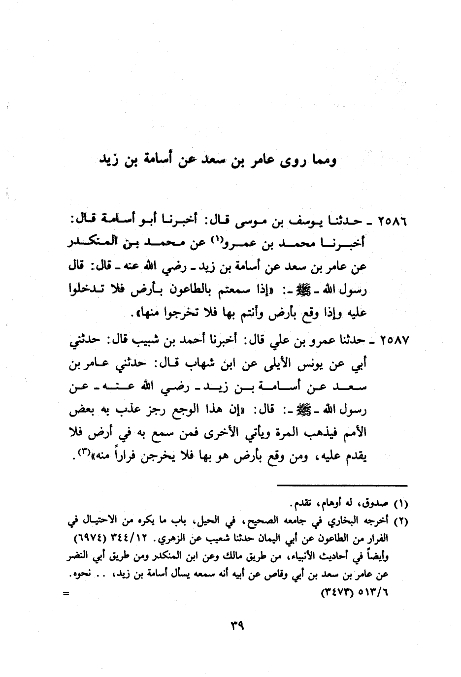 2586 - حَدَّثَنَا يُوسُفُ بْنُ مُوسَى، قَالَ: أَخْبَرَنَا أَبُو أُسَامَةَ، قَالَ: أَخْبَرَنَا مُحَمَّدُ بْنُ عَمْرٍو، عَنْ مُحَمَّدِ بْنِ الْمُنْكَدِرِ، عَنْ عَامِرِ بْنِ سَعْدٍ، عَنْ أُسَامَةَ بْنِ زَيْدٍ رَضِيَ اللَّهُ عَنْهُ قَالَ: قَالَ رَسُولُ اللَّهِ صَلَّى اللهُ عَلَيْهِ وَسَلَّمَ: «§إِذَا سَمِعْتُمْ بِالطَّاعُونِ بِأَرْضٍ فَلَا تَدْخُلُوا عَلَيْهِ، وَإِذَا وَقَعَ بِأَرْضٍ وَأَنْتُمْ بِهَا فَلَا تَخْرُجُوا مِنْهَا»