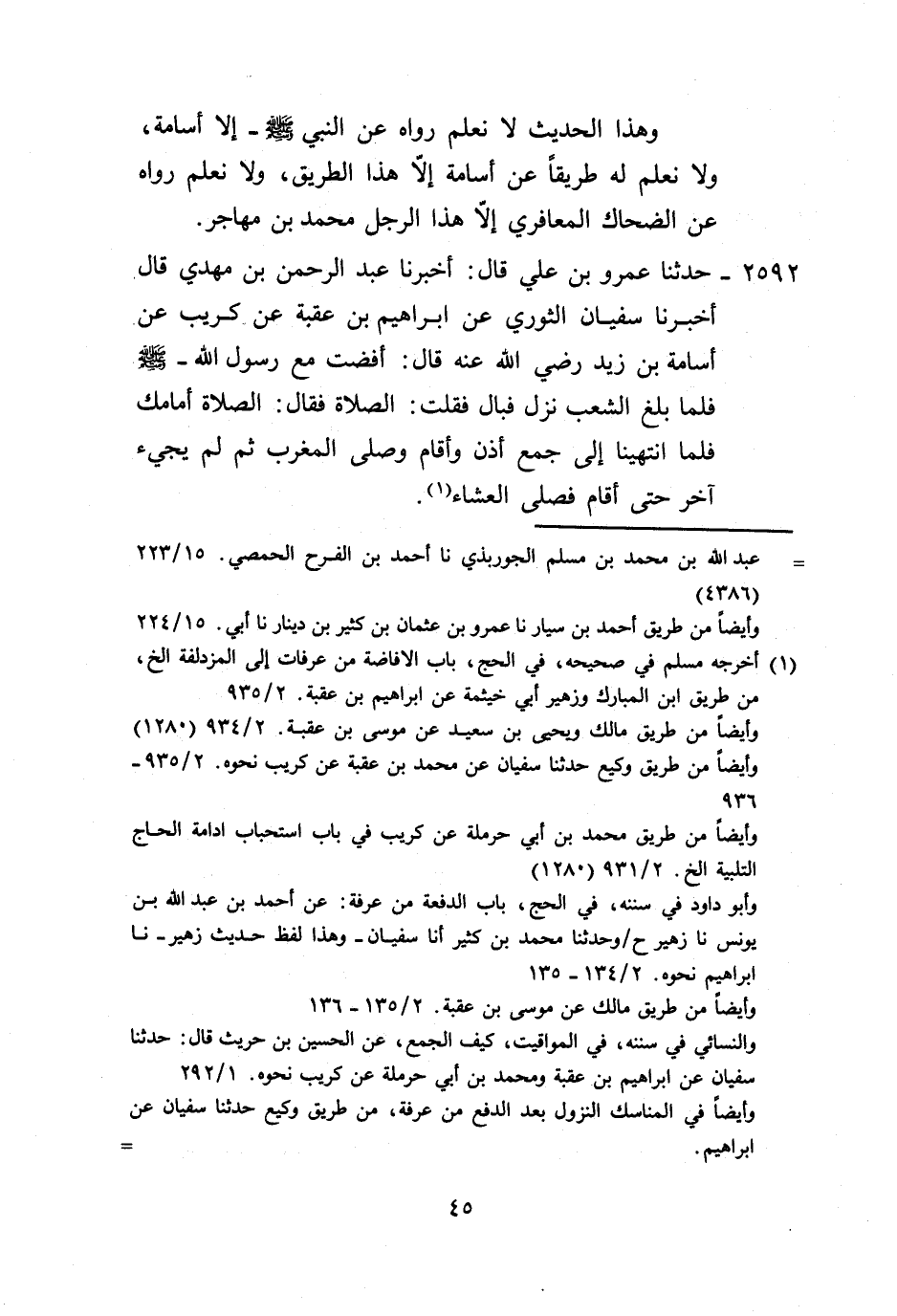 2592 - حَدَّثَنَا عَمْرُو بْنُ عَلِيٍّ، قَالَ: أَخْبَرَنَا عَبْدُ الرَّحْمَنِ بْنُ مَهْدِيٍّ، قَالَ: أَخْبَرَنَا سُفْيَانُ الثَّوْرِيُّ، عَنْ إِبْرَاهِيمَ بْنِ عُقْبَةَ، عَنْ كُرَيْبٍ، عَنْ أُسَامَةَ بْنِ زَيْدٍ رَضِيَ اللَّهُ عَنْهُ قَالَ: أَفَضْتُ مَعَ رَسُولِ اللَّهِ صَلَّى اللهُ عَلَيْهِ وَسَلَّمَ، فَلَمَّا بَلَغَ الشِّعْبَ نَزَلَ فَبَالَ فَقُلْتُ: الصَّلَاةَ، فَقَالَ: «§الصَّلَاةُ أَمَامَكَ» ، فَلَمَّا انْتَهَيْنَا إِلَى جَمْعٍ أَذَّنَ، وَأَقَامَ، وَصَلَّى الْمَغْرِبَ، ثُمَّ لَمْ يَجِئْ آخَرَ حَتَّى أَقَامَ فَصَلَّى الْعِشَاءَ