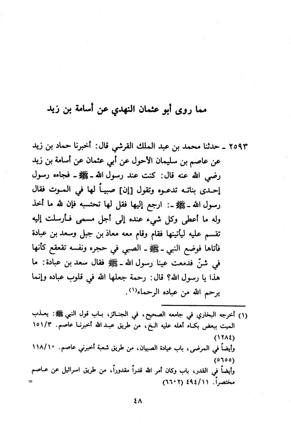 2593 - حَدَّثَنَا مُحَمَّدُ بْنُ عَبْدِ الْمَلِكِ الْقُرَشِيُّ، قَالَ: أَخْبَرَنَا حَمَّادُ بْنُ زَيْدٍ، عَنْ عَاصِمِ بْنِ سُلَيْمَانَ الْأَحْوَلِ، عَنْ أَبِي عُثْمَانَ، عَنْ أُسَامَةَ بْنِ زَيْدٍ رَضِيَ اللَّهُ عَنْهُ قَالَ: كُنْتُ عِنْدَ رَسُولِ اللَّهِ صَلَّى اللهُ عَلَيْهِ وَسَلَّمَ فَجَاءَهُ رَسُولُ إِحْدَى بَنَاتِهِ تَدْعُوهُ وَتَقُولُ: إِنَّ صَبِيًّا لَهَا فِي الْمَوْتِ، فَقَالَ رَسُولُ اللَّهِ صَلَّى اللهُ عَلَيْهِ وَسَلَّمَ: «ارْجِعْ إِلَيْهَا فَقُلْ لَهَا تَحْتَسِبُهُ فَإِنَّ لِلَّهِ مَا أَخَذَ وَلَهُ مَا أَعْطَى، وَكُلُّ شَيْءٍ عِنْدَهُ إِلَى أَجْلٍ مُسَمًّى» فَأَرْسَلَتْ إِلَيْهِ تُقْسِمُ عَلَيْهِ لَيَأْتِيَنَّهَا فَقَامَ، وَقَامَ مَعَهُ مُعَاذُ بْنُ جَبَلٍ، وَسَعْدُ بْنُ عُبَادَةَ فَأَتَاهَا فَوَضَعَ النَّبِيُّ صَلَّى اللهُ عَلَيْهِ وَسَلَّمَ الصَّبِيَّ فِي حِجْرِهِ وَنَفْسُهُ تُقَعْقِعُ كَأَنَّهَا فِي شَنٍّ فَدَمِعَتْ عَيْنَا رَسُولِ اللَّهِ صَلَّى اللهُ عَلَيْهِ وَسَلَّمَ، فَقَالَ سَعْدُ بْنُ عُبَادَةَ: مَا هَذَا يَا رَسُولَ اللَّهِ؟، قَالَ: «§رَحْمَةٌ جَعَلَهَا اللَّهُ فِي قُلُوبِ عِبَادِهِ، وَإِنَّمَا يَرْحَمُ اللَّهُ مِنْ عِبَادِهِ الرُّحَمَاءَ» -[49]- وَهَذَا الْحَدِيثُ لَا نَعْلَمُهُ يُرْوَى مِنْ حَدِيثِ أُسَامَةَ إِلَّا مِنْ هَذَا الْوَجْهِ بِهَذَا الْإِسْنَادِ إِلَّا أَنَّهُ قَدْ رَوَاهُ عَنْ عَاصِمٍ، عَنْ أَبِي عُثْمَانَ غَيْرُ وَاحِدٍ
