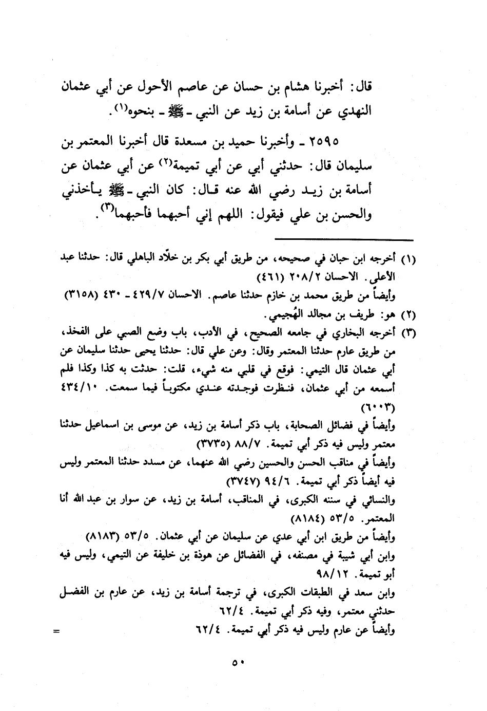 2595 - وَأَخْبَرَنَا حُمَيْدُ بْنُ مَسْعَدَةَ، قَالَ: أَخْبَرَنَا الْمُعْتَمِرُ بْنُ سُلَيْمَانَ، قَالَ: حَدَّثَنِي أَبِي، عَنْ أَبِي تَمِيمَةَ، عَنْ أَبِي عُثْمَانَ، عَنْ أُسَامَةَ بْنِ زَيْدٍ رَضِيَ اللَّهُ عَنْهُ قَالَ: كَانَ النَّبِيُّ صَلَّى اللهُ عَلَيْهِ وَسَلَّمَ، يَأْخُذُنِي وَالْحَسَنَ بْنَ عَلِيٍّ فَيَقُولُ: «§اللَّهُمَّ إِنِّي أُحِبُّهُمَا فَأَحِبَّهُمَا» -[51]- وَهَذَا الْحَدِيثُ إِنَّمَا يُرْوَى عَنْ أُسَامَةَ بْنِ زَيْدٍ: أَنَّ النَّبِيَّ صَلَّى اللهُ عَلَيْهِ وَسَلَّمَ: قَالَ لِلْحَسَنِ، وَالْحُسَيْنِ، وَقَالَ فِي حَدِيثِ أَبِي عُثْمَانَ، عَنْ أُسَامَةَ أَنَّهُ قَالَ لَهُ وَلِلْحَسَنِ،