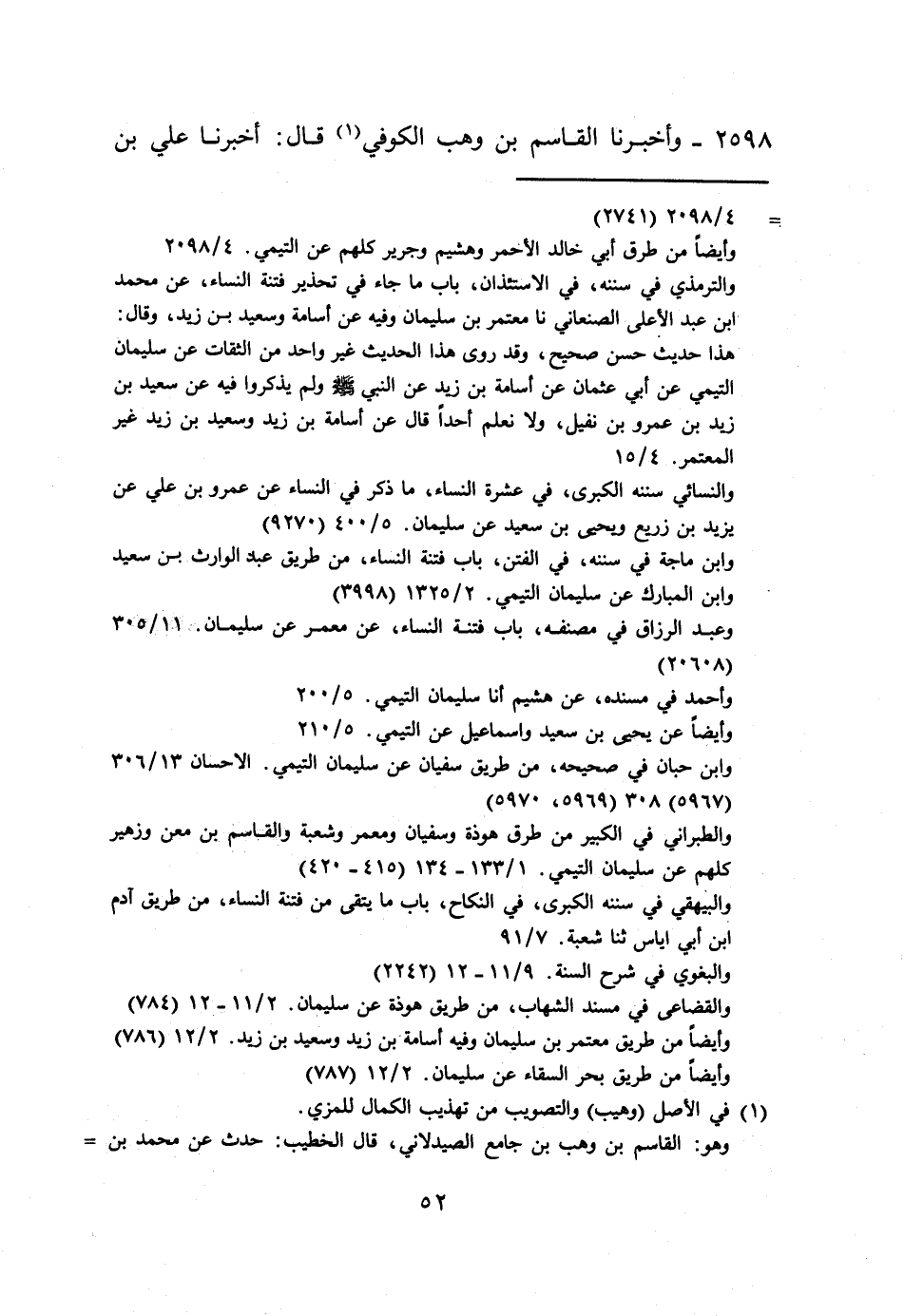 2598 - وَأَخْبَرَنَا الْقَاسِمُ بْنُ وَهْبٍ الْكُوفِيُّ، قَالَ: أَخْبَرَنَا عَلِيُّ بْنُ -[53]- عَبْدِ الْحَمِيدِ، قَالَ: أَخْبَرَنَا مَنْدَلٌ، عَنْ عَاصِمٍ الْأَحْوَلِ، عَنْ أَبِي عُثْمَانَ، عَنْ أُسَامَةَ رَضِيَ اللَّهُ عَنْهُ، عَنِ النَّبِيِّ صَلَّى اللهُ عَلَيْهِ وَسَلَّمَ قَالَ: «§مَا تَرَكْتُ بَعْدِي فِتْنَةً هِيَ أَضَرُّ عَلَى الرِّجَالِ مِنَ النِّسَاءِ» وَهَذَا الْحَدِيثُ لَا نَعْلَمُ رَوَاهُ عَنْ عَاصِمٍ، عَنْ أَبِي عُثْمَانَ، عَنْ أُسَامَةَ إِلَّا مَنْدَلٌ، وَإِنَّمَا يُعْرَفُ مِنْ حَدِيثِ التَّيْمِيِّ، عَنْ أَبِي عُثْمَانَ، عَنْ أُسَامَةَ،