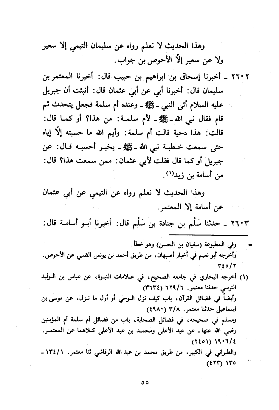 2602 - أَخْبَرَنَا إِسْحَاقُ بْنُ إِبْرَاهِيمَ بْنِ حَبِيبٍ، قَالَ: أَخْبَرَنَا الْمُعْتَمِرُ بْنُ سُلَيْمَانَ، قَالَ: أَخْبَرَنَا أَبِي، عَنْ أَبِي عُثْمَانَ، قَالَ: §أُنْبِئْتُ أَنَّ جِبْرِيلَ عَلَيْهِ السَّلَامُ أَتَى النَّبِيَّ صَلَّى اللهُ عَلَيْهِ وَسَلَّمَ، وَعِنْدَهُ أُمُّ سَلَمَةَ فَجَعَلَ يَتَحَدَّثُ، ثُمَّ قَامَ فَقَالَ نَبِيُّ اللَّهِ صَلَّى اللهُ عَلَيْهِ وَسَلَّمَ، لِأُمِّ سَلَمَةَ: «مَنْ هَذَا؟» ، أَوْ كَمَا قَالَ: "، قَالَتْ: هَذَا دِحْيَةُ، قَالَتْ أُمُّ سَلَمَةَ: وَايْمِ اللَّهِ، مَا حَسِبْتُهُ إِلَّا إِيَّاهُ حَتَّى سَمِعْتُ خُطْبَةَ نَبِيِّ اللَّهِ صَلَّى اللهُ عَلَيْهِ وَسَلَّمَ يُخْبِرُ أَحْسِبُهُ، قَالَ: «عَنْ جِبْرِيلَ أَوْ كَمَا قَالَ» ، فَقُلْتُ لِأَبِي عُثْمَانَ: مِمَّنْ سَمِعْتَ هَذَا؟، قَالَ: مِنْ أُسَامَةَ بْنِ زَيْدٍ " وَهَذَا الْحَدِيثُ لَا نَعْلَمُ رَوَاهُ عَنِ التَّيْمِيِّ، عَنْ أَبِي عُثْمَانَ، عَنْ أُسَامَةَ إِلَّا الْمُعْتَمِرُ