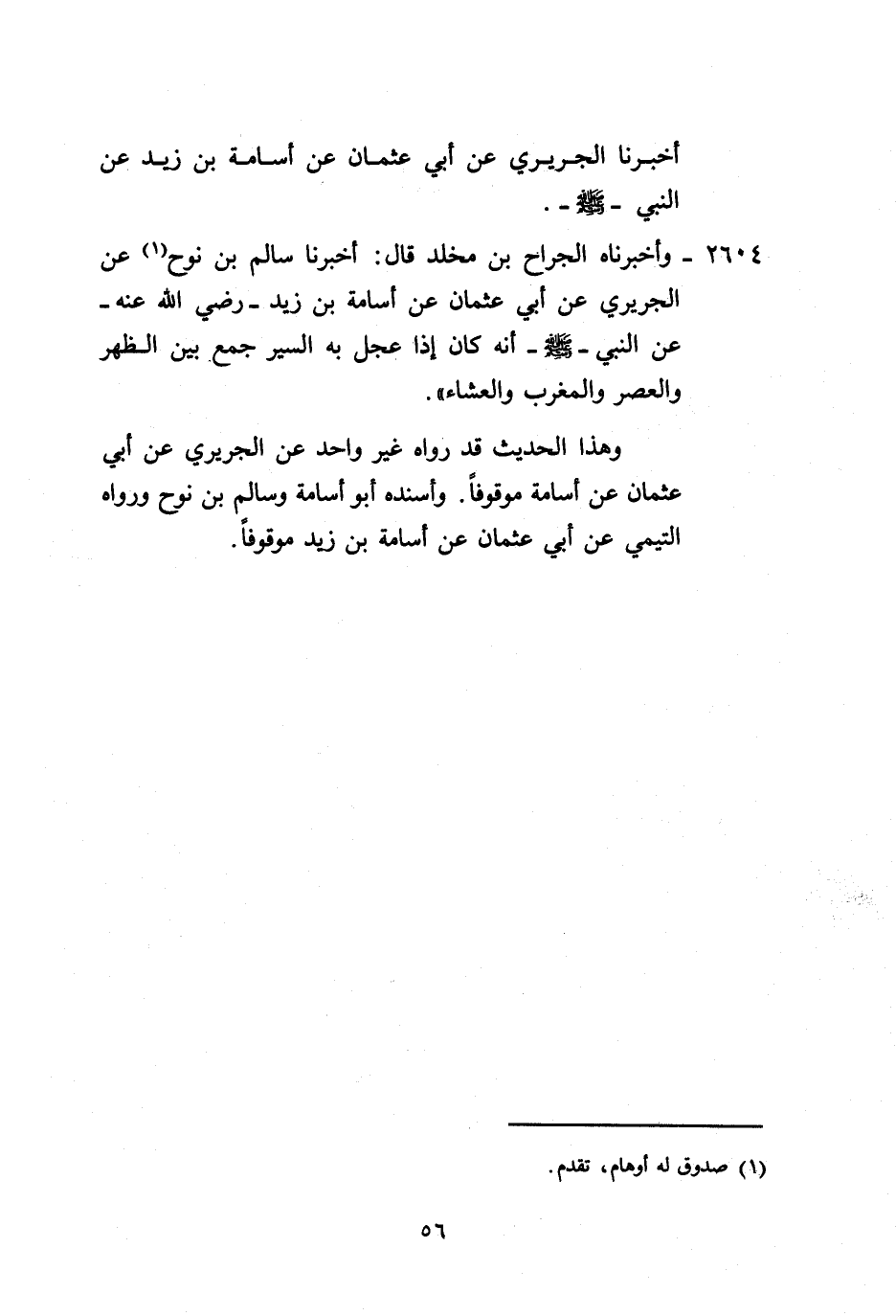 2604 - وَأَخْبَرَنَاهُ الْجَرَّاحُ بْنُ مَخْلَدٍ، قَالَ: أَخْبَرَنَا سَالِمُ بْنُ نُوحٍ، عَنْ أَبِي عُثْمَانَ، عَنْ أُسَامَةَ بْنِ زَيْدٍ رَضِيَ اللَّهُ عَنْهُ، عَنِ النَّبِيِّ صَلَّى اللهُ عَلَيْهِ وَسَلَّمَ أَنَّهُ: «كَانَ §إِذَا عَجَّلَ بِهِ السَّيْرُ جَمَعَ بَيْنَ الظُّهْرِ، وَالْعَصْرِ، وَالْمَغْرِبِ، وَالْعِشَاءِ» وَهَذَا الْحَدِيثُ قَدْ رَوَاهُ غَيْرُ وَاحِدٍ عَنِ الْجُرَيْرِيِّ، عَنْ أَبِي عُثْمَانَ، عَنْ أُسَامَةَ مَوْقُوفًا، وَأَسْنَدَهُ أَبُو أُسَامَةَ، وَسَالِمُ بْنُ نُوحٍ، وَرَوَاهُ التَّيْمِيُّ، عَنْ أَبِي عُثْمَانَ، عَنْ أُسَامَةَ بْنِ زَيْدٍ مَوْقُوفًا