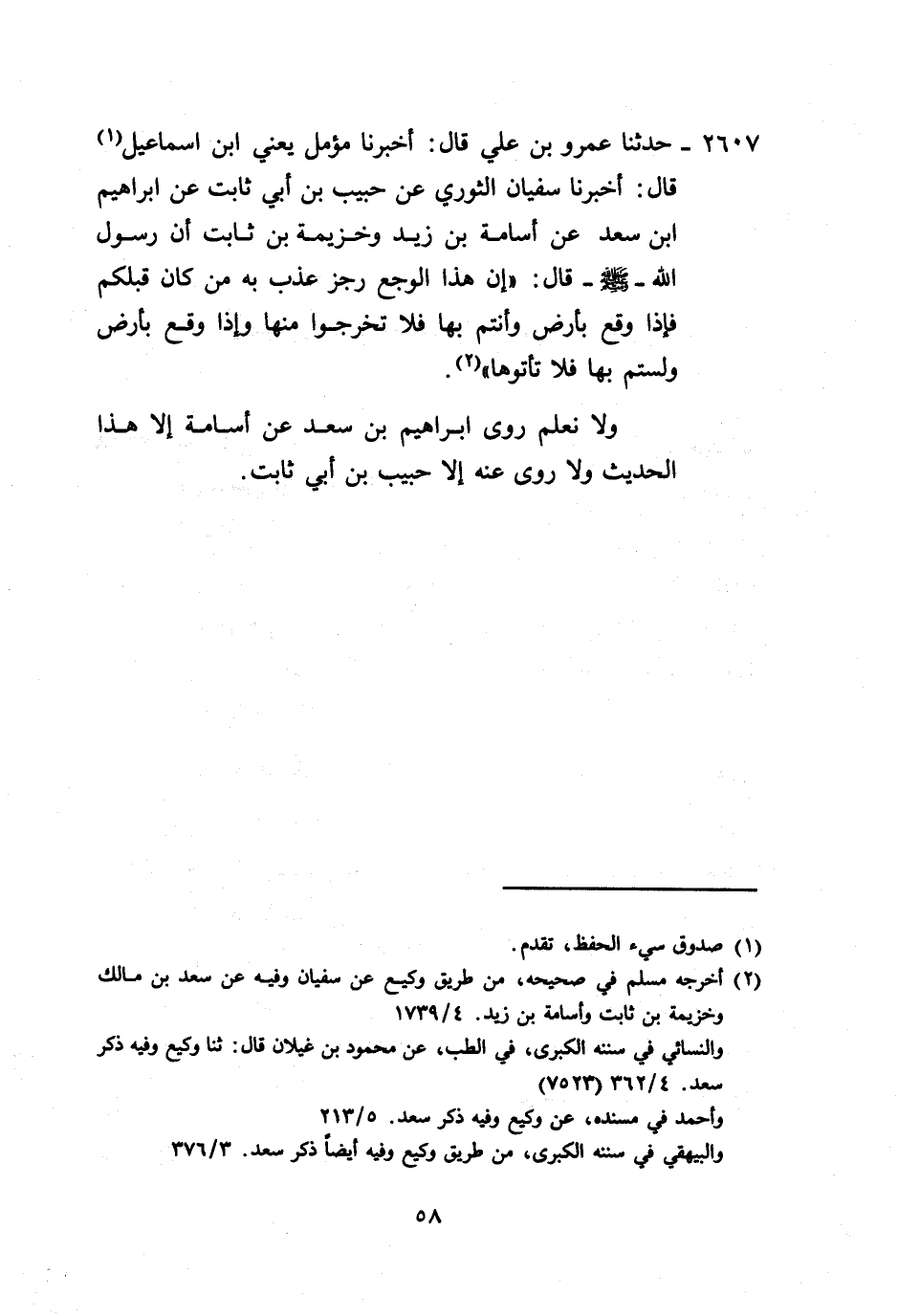 2607 - حَدَّثَنَا عَمْرُو بْنُ عَلِيٍّ، قَالَ: أَخْبَرَنَا مُؤَمَّلٌ يَعْنِي ابْنَ إِسْمَاعِيلَ، قَالَ: أَخْبَرَنَا سُفْيَانُ الثَّوْرِيُّ، عَنْ حَبِيبِ بْنِ أَبِي ثَابِتٍ، عَنْ إِبْرَاهِيمَ بْنِ سَعْدٍ، عَنْ أُسَامَةَ بْنِ زَيْدٍ، وَخُزَيْمَةَ بْنِ ثَابِتٍ: أَنَّ رَسُولَ اللَّهِ صَلَّى اللهُ عَلَيْهِ وَسَلَّمَ قَالَ: «إِنَّ §هَذَا الْوَجَعَ رِجْزٌ عُذِّبَ بِهِ مَنْ كَانَ قَبْلَكُمْ فَإِذَا وَقَعَ بِأَرْضٍ وَأَنْتُمْ بِهَا فَلَا تَخْرُجُوا مِنْهَا، وَإِذَا وَقَعَ بِأَرْضٍ وَلَسْتُمْ بِهَا فَلَا تَأْتُوهَا» وَلَا نَعْلَمُ رَوَى إِبْرَاهِيمُ بْنُ سَعْدٍ، عَنْ أُسَامَةَ إِلَّا هَذَا الْحَدِيثَ، وَلَا رَوَى عَنْهُ إِلَّا حَبِيبُ بْنُ أَبِي ثَابِتٍ