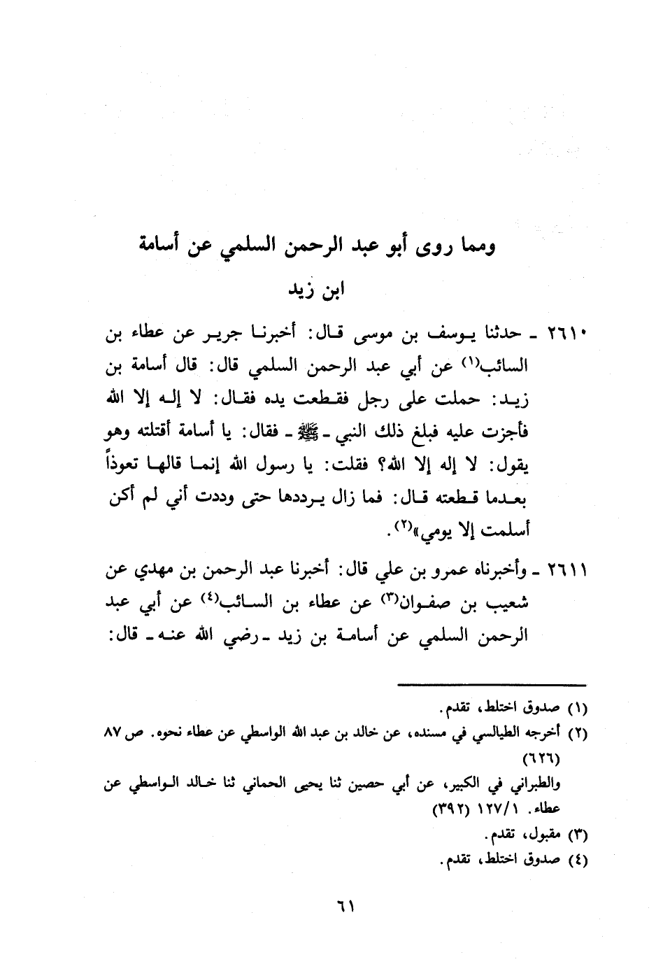 2610 - حَدَّثَنَا يُوسُفُ بْنُ مُوسَى، قَالَ: أَخْبَرَنَا جَرِيرٌ، عَنْ عَطَاءِ بْنِ السَّائِبِ، عَنْ أَبِي عَبْدِ الرَّحْمَنِ السُّلَمِيِّ، قَالَ: قَالَ أُسَامَةُ بْنُ زَيْدٍ: حَمَلْتُ عَلَى رَجُلٍ فَقَطَعْتُ يَدَهُ، فَقَالَ: لَا إِلَهَ إِلَّا اللَّهُ فَأَجَزْتُ عَلَيْهِ، فَبَلَغَ ذَلِكَ النَّبِيَّ صَلَّى اللهُ عَلَيْهِ وَسَلَّمَ فَقَالَ: " §يَا أُسَامَةُ، أَقَتَلْتَهُ، وَهُوَ يَقُولُ: لَا إِلَهَ إِلَّا اللَّهُ؟ "، فَقُلْتُ: يَا رَسُولَ اللَّهِ، إِنَّمَا قَالَهَا تَعَوُّذًا بَعْدَمَا قَطَعْتُهُ، قَالَ: فَمَا زَالَ يُرَدِّدُهَا حَتَّى وَدِدْتُ أَنِّي لَمْ أَكُنْ أَسْلَمْتُ إِلَّا يَوْمِي