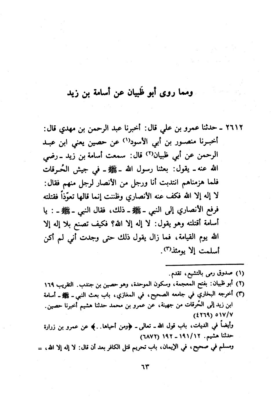 2612 - حَدَّثَنَا عَمْرُو بْنُ عَلِيٍّ، قَالَ: أَخْبَرَنَا عَبْدُ الرَّحْمَنِ بْنُ مَهْدِيٍّ، قَالَ: أَخْبَرَنَا مَنْصُورُ بْنُ أَبِي الْأَسْوَدِ، عَنْ حُصَيْنٍ يَعْنِي ابْنَ عَبْدِ الرَّحْمَنِ، عَنْ أَبِي ظَبْيَانَ، قَالَ: سَمِعْتُ أُسَامَةَ بْنَ زَيْدٍ رَضِيَ اللَّهُ عَنْهُ يَقُولُ: بَعَثَنَا رَسُولُ اللَّهِ صَلَّى اللهُ عَلَيْهِ وَسَلَّمَ فِي جَيْشِ الْحُرُقَاتِ فَلَمَّا هَزَمْنَاهُمْ انْتَدَبْتُ أَنَا، وَرَجُلٌ مِنَ الْأَنْصَارِ لِرَجُلٍ مِنْهُمْ فَقَالَ: لَا إِلَهَ إِلَّا اللَّهُ، فَكَفَّ عَنْهُ الْأَنْصَارِيُّ وَظَنَنْتُ أَنَّمَا قَالَهَا؛ تَعَوُّذًا فَقَتَلْتُهُ، فَرَفَعَ الْأَنْصَارِيُّ إِلَى النَّبِيِّ صَلَّى اللهُ عَلَيْهِ وَسَلَّمَ ذَلِكَ فَقَالَ النَّبِيُّ: " §يَا أُسَامَةُ أَقَتَلْتَهُ وَهُوَ يَقُولُ: لَا إِلَهَ إِلَّا اللَّهُ؟، فَكَيْفَ تَصْنَعُ بِلَا إِلَهَ إِلَّا اللَّهُ يَوْمَ الْقِيَامَةِ؟ "، فَمَا زَالَ يَقُولُ ذَلِكَ حَتَّى وَجَدْتُ أَنِّي لَمْ أَكُنْ أَسْلَمْتُ إِلَّا يَوْمَئِذٍ
