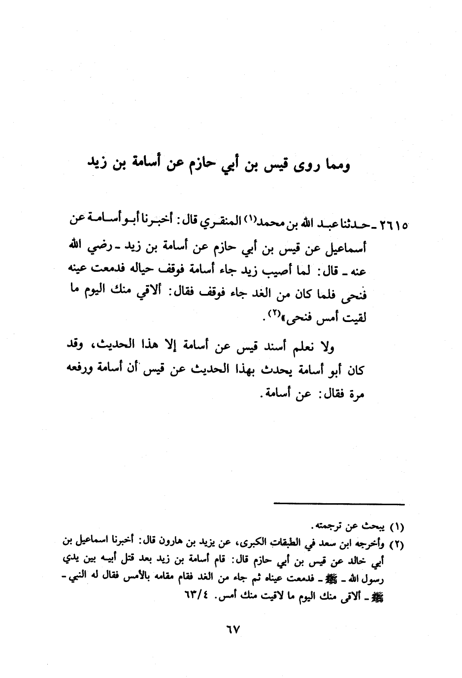 2615 - حَدَّثَنَا عَبْدُ اللَّهِ بْنُ مُحَمَّدٍ الْمِنْقَرِيُّ، قَالَ: أَخْبَرَنَا أَبُو أُسَامَةَ، عَنْ إِسْمَاعِيلَ، عَنْ قَيْسِ بْنِ أَبِي حَازِمٍ، عَنْ أُسَامَةَ بْنِ زَيْدٍ رَضِيَ اللَّهُ عَنْهُ قَالَ: لَمَّا أُصِيبَ زَيْدٌ جَاءَ أُسَامَةُ فَوَقَفَ حِيَالَهُ فَدَمَعَتْ عَيْنُهُ فَنُحِّيَ فَلَمَّا كَانَ مِنَ الْغَدِ جَاءَ فَوَقَفَ فَقَالَ: «§أُلَاقِي مِنْكَ الْيَوْمَ مَا لَقِيتُ أَمْسِ، فَنُحِّيَ» وَلَا نَعْلَمُ أَسْنَدَ قَيْسٌ، عَنْ أُسَامَةَ إِلَّا هَذَا الْحَدِيثَ، وَقَدْ كَانَ أَبُو أُسَامَةَ يُحَدِّثُ بِهَذَا الْحَدِيثِ، عَنْ قَيْسٍ أَنَّ أُسَامَةَ، وَرَفَعَهُ مَرَّةً فَقَالَ: عَنْ أُسَامَةَ
