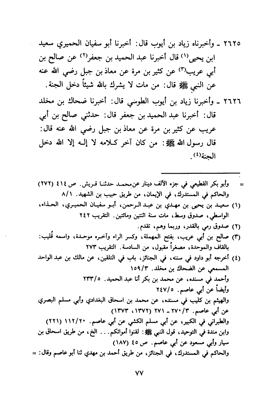2626 - وَأَخْبَرَنَا زِيَادُ بْنُ أَيُّوبَ الطُّوسِيُّ، قَالَ: أَخْبَرَنَا ضَحَّاكُ بْنُ مَخْلَدٍ، قَالَ: أَخْبَرَنَا عَبْدُ الْحَمِيدِ بْنُ جَعْفَرٍ، قَالَ: حَدَّثَنِي صَالِحُ بْنُ أَبِي عَرِيبٍ، عَنْ كَثِيرِ بْنِ مُرَّةَ، عَنْ مُعَاذِ بْنِ جَبَلٍ رَضِيَ اللَّهُ عَنْهُ قَالَ: قَالَ رَسُولُ اللَّهِ صَلَّى اللهُ عَلَيْهِ وَسَلَّمَ: «§مَنْ كَانَ آخِرُ كَلَامِهِ لَا إِلَهَ إِلَّا اللَّهُ دَخَلَ الْجَنَّةَ»