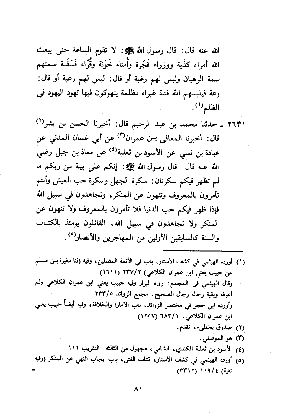 2631 - حَدَّثَنَا مُحَمَّدُ بْنُ عَبْدِ الرَّحِيمِ، قَالَ: أَخْبَرَنَا الْحَسَنُ بْنُ بِشْرٍ، قَالَ: أَخْبَرَنَا الْمُعَافَى بْنُ عِمْرَانَ، عَنْ أَبِي غَسَّانَ الْمَدَنِيِّ، عَنْ عُبَادَةَ بْنِ نُسَيٍّ، عَنِ الْأَسْوَدِ بْنِ ثَعْلَبَةَ، عَنْ مُعَاذِ بْنِ جَبَلٍ رَضِيَ اللَّهُ عَنْهُ قَالَ: قَالَ رَسُولُ اللَّهِ صَلَّى اللهُ عَلَيْهِ وَسَلَّمَ: «§إِنَّكُمْ عَلَى بَيِّنَةٍ مِنْ رَبِّكُمْ مَا لَمْ تَظْهَرْ فِيكُمْ سَكْرَتَانِ، سَكْرَةُ الْجَهْلِ، وَسَكْرَةُ حُبِّ الْعَيْشِ، وَأَنْتُمْ تَأْمُرُونَ بِالْمَعْرُوفِ، وَتَنْهَوْنَ عَنِ الْمُنْكَرِ، وَتُجَاهِدُونَ فِي سَبِيلِ اللَّهِ فَإِذَا ظَهَرَ فِيكُمْ حُبُّ الدُّنْيَا فَلَا تَأْمُرُونَ بِالْمَعْرُوفِ، وَلَا تَنْهَوْنَ عَنِ الْمُنْكَرِ، وَلَا تُجَاهِدُونَ فِي سَبِيلِ اللَّهِ، الْقَائِلُونَ يَوْمَئِذٍ بِالْكِتَابِ، وَالسُّنَّةِ كَالسَّابِقِينَ الْأَوَّلِينَ مِنَ الْمُهَاجِرِينَ، وَالْأَنْصَارِ»