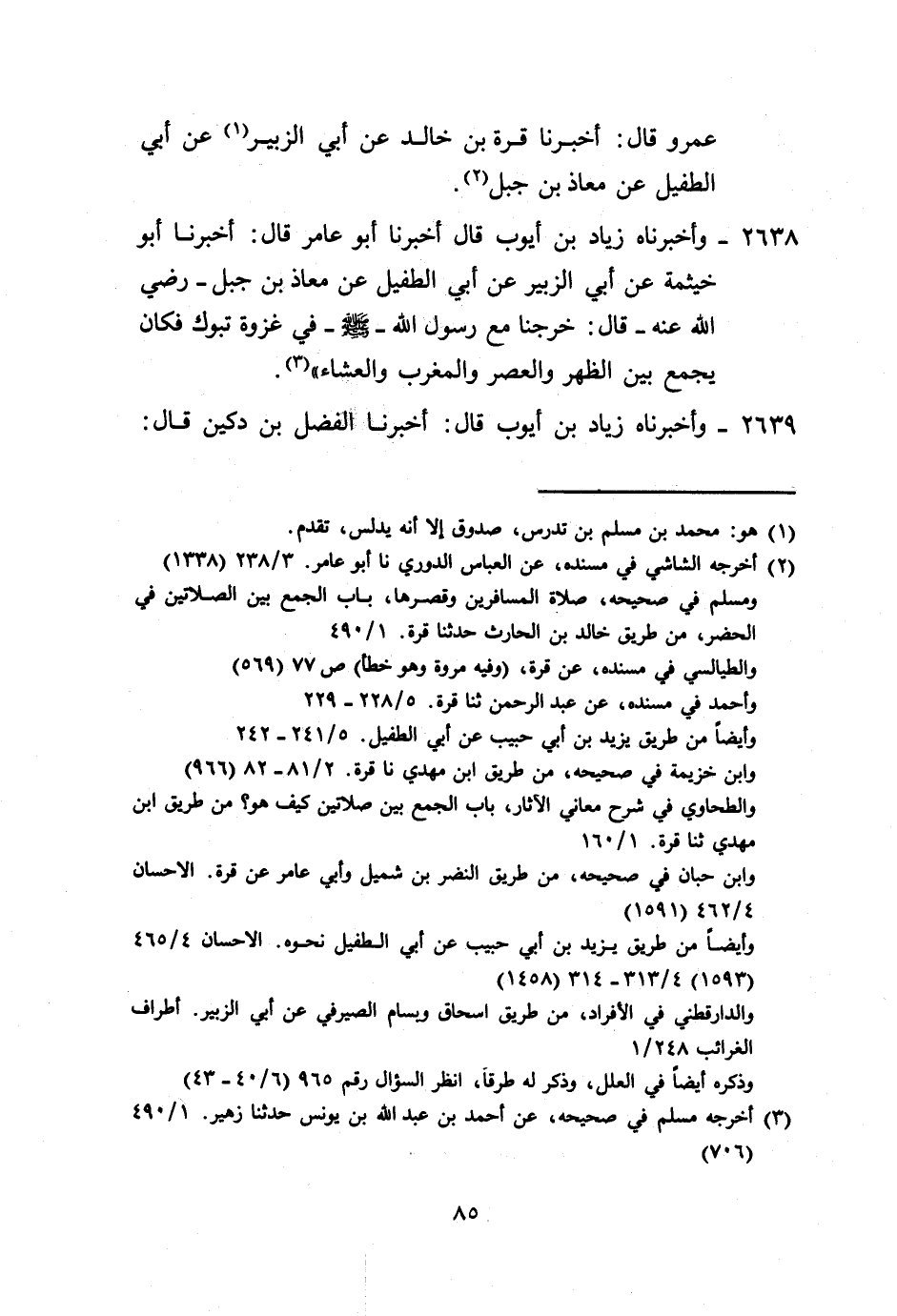 2638 - وَأَخْبَرَنَاهُ زِيَادُ بْنُ أَيُّوبَ، قَالَ: أَخْبَرَنَا أَبُو عَامِرٍ، قَالَ: أَخْبَرَنَا أَبُو خَيْثَمَةَ، عَنْ أَبِي الزُّبَيْرِ، عَنْ أَبِي الطُّفَيْلِ، عَنْ مُعَاذِ بْنِ جَبَلٍ رَضِيَ اللَّهُ عَنْهُ قَالَ: «خَرَجْنَا مَعَ رَسُولِ اللَّهِ صَلَّى اللهُ عَلَيْهِ وَسَلَّمَ فِي غَزْوَةِ تَبُوكَ فَكَانَ §يَجْمَعُ بَيْنَ الظُّهْرِ، وَالْعَصْرِ، وَالْمَغْرِبِ، وَالْعِشَاءِ»