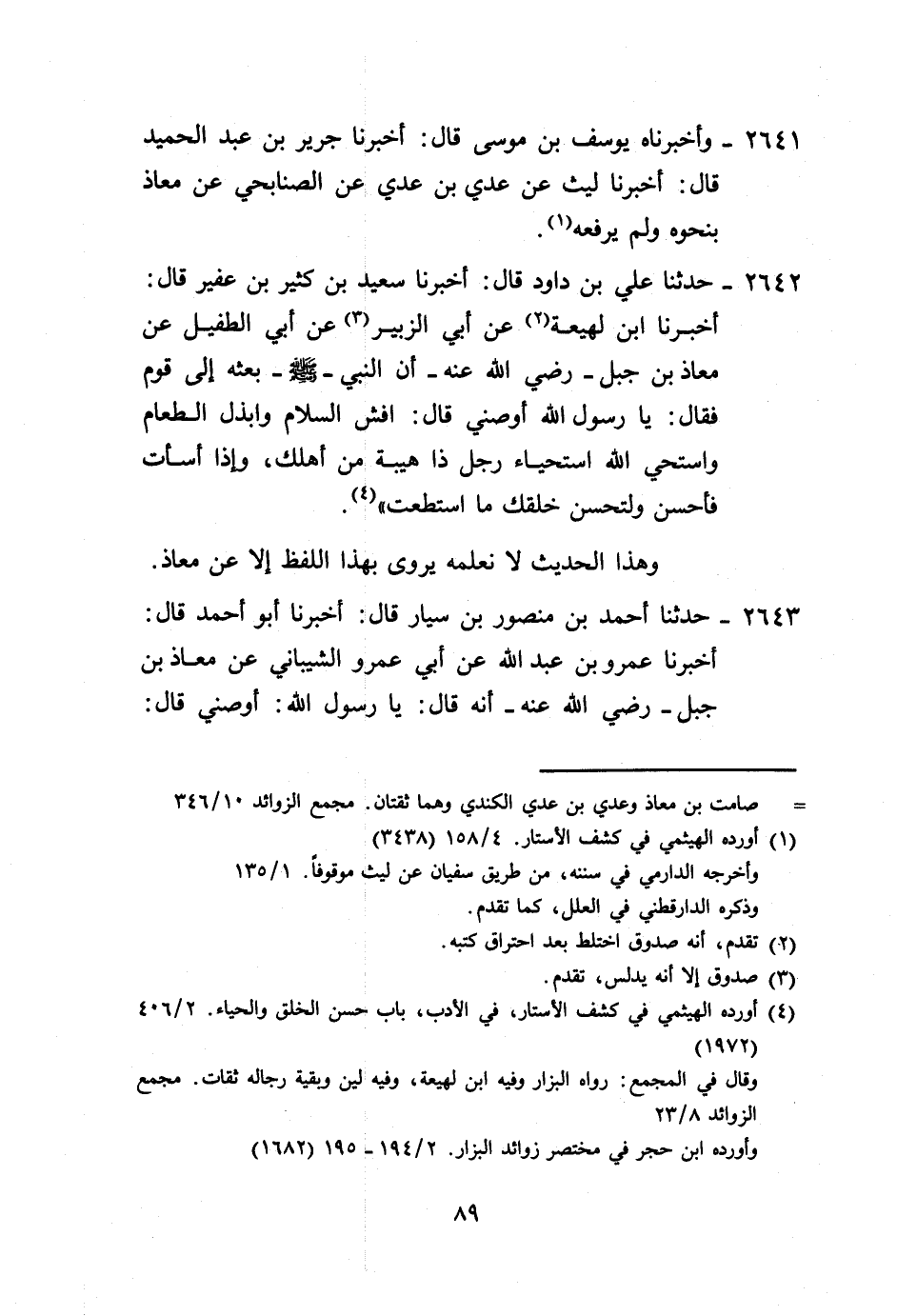 2642 - حَدَّثَنَا عَلِيُّ بْنُ دَاوُدَ، قَالَ: أَخْبَرَنَا سَعِيدُ بْنُ كَثِيرِ بْنِ عُفَيْرٍ، قَالَ: أَخْبَرَنَا ابْنُ لَهِيعَةَ، عَنْ أَبِي الزُّبَيْرِ، عَنْ أَبِي الطُّفَيْلِ، عَنْ مُعَاذِ بْنِ جَبَلٍ رَضِيَ اللَّهُ عَنْهُ: أَنَّ النَّبِيَّ صَلَّى اللهُ عَلَيْهِ وَسَلَّمَ بَعَثَهُ إِلَى قَوْمٍ فَقَالَ: يَا رَسُولَ اللَّهِ، أَوْصِنِي، قَالَ: «§أَفْشِ السَّلَامَ، وَابْذُلِ الطَّعَامَ، وَاسْتَحِ اللَّهَ اسْتِحْيَاءَ رَجُلٍ ذِي هَيْبَةٍ مِنْ أَهْلِكِ، وَإِذَا أَسَأْتَ فَأَحْسِنْ وَلْتُحْسِنْ خُلُقَكَ مَا اسْتَطَعْتَ» وَهَذَا الْحَدِيثُ لَا نَعْلَمُهُ يُرْوَى بِهَذَا اللَّفْظِ إِلَّا عَنْ مُعَاذٍ