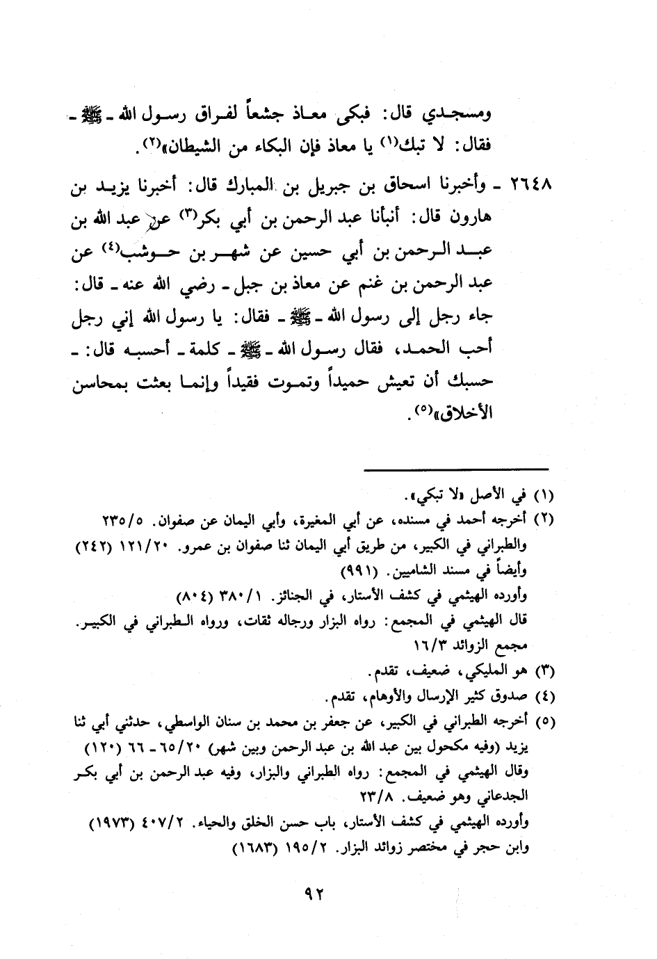 2648 - وَأَخْبَرَنَا إِسْحَاقُ بْنُ جِبْرِيلَ بْنِ الْمُبَارَكِ، قَالَ: أَخْبَرَنَا يَزِيدُ بْنُ هَارُونَ، قَالَ: أَنْبَأَنَا عَبْدُ الرَّحْمَنِ بْنُ أَبِي بَكْرٍ، عَنْ عَبْدِ اللَّهِ بْنِ عَبْدِ الرَّحْمَنِ بْنِ أَبِي حُسَيْنٍ، عَنْ شَهْرِ بْنِ حَوْشَبٍ، عَنْ عَبْدِ الرَّحْمَنِ بْنِ غَنْمٍ، عَنْ مُعَاذِ بْنِ جَبَلٍ رَضِيَ اللَّهُ عَنْهُ قَالَ: جَاءَ رَجُلٌ إِلَى رَسُولِ اللَّهِ صَلَّى اللهُ عَلَيْهِ وَسَلَّمَ فَقَالَ: يَا رَسُولَ اللَّهِ، إِنِّي رَجُلٌ أُحِبُّ الْحَمْدَ، فَقَالَ رَسُولُ اللَّهِ صَلَّى اللهُ عَلَيْهِ وَسَلَّمَ كَلِمَةً أَحْسَبُهُ قَالَ: «§حَسْبُكَ أَنْ تَعِيشَ حَمِيدًا، وَتَمُوتَ فَقِيدًا، وَإِنَّمَا بُعِثْتُ بِمَحَاسِنِ الْأَخْلَاقِ»
