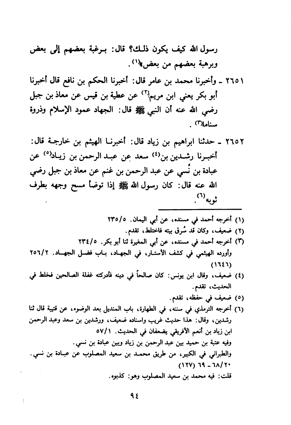 2651 - وَأَخْبَرَنَا مُحَمَّدُ بْنُ عَامِرٍ، قَالَ: أَخْبَرَنَا الْحَكَمُ بْنُ نَافِعٍ، قَالَ " أَخْبَرَنَا أَبُو بَكْرٍ يَعْنِي ابْنَ مَرْيَمَ، عَنْ عَطِيَّةَ بْنِ قَيْسٍ، عَنْ مُعَاذِ بْنِ جَبَلٍ رَضِيَ اللَّهُ عَنْهُ أَنَّ النَّبِيَّ صَلَّى اللهُ عَلَيْهِ وَسَلَّمَ قَالَ: «§الْجِهَادُ عَمُودُ الْإِسْلَامِ، وَذُرْوَةُ سَنَامِهِ»