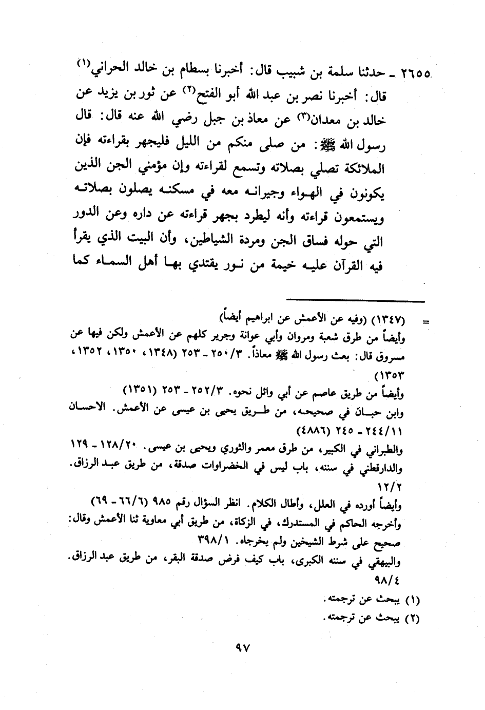 2655 - حَدَّثَنَا سَلَمَةُ بْنُ شَبِيبٍ، قَالَ: أَخْبَرَنَا بِسْطَامُ بْنُ خَالِدٍ الْحَرَّانِيُّ، قَالَ: أَخْبَرَنَا نَصْرُ بْنُ عَبْدِ اللَّهِ أَبُو الْفَتْحِ، عَنْ ثَوْرِ بْنِ يَزِيدَ، عَنْ خَالِدِ بْنِ مَعْدَانَ، عَنْ مُعَاذِ بْنِ جَبَلٍ رَضِيَ اللَّهُ عَنْهُ قَالَ: قَالَ رَسُولُ اللَّهِ صَلَّى اللهُ عَلَيْهِ وَسَلَّمَ: " §مَنْ صَلَّى مِنْكُمْ مِنَ اللَّيْلِ فَلْيَجْهَرْ بِقِرَاءَتِهِ؛ فَإِنَّ الْمَلَائِكَةَ تُصَلِّي بِصَلَاتِهِ، وَتَسْمَعُ لِقِرَاءَتِهِ، وَإِنَّ مُؤْمِنِي الْجِنِّ الَّذِينَ يَكُونُونَ فِي الْهَوَاءِ، وَجِيرَانَهُ مَعَهُ فِي مَسْكَنِهِ يُصَلُّونَ بِصَلَاتِهِ، وَيَسْتَمِعُونَ قِرَاءَتَهُ، وَإِنَّهُ لَيَطْرُدُ بِجِهْرِ قِرَاءَتِهِ عَنْ دَارِهِ، وَعَنِ الدُّورِ الَّتِي حَوْلَهُ فُسَّاقَ الْجِنِّ، وَمَرَدَةَ الشَّيَاطِينِ، وَإِنَّ الْبَيْتَ الَّذِي يُقْرَأُ فِيهِ الْقُرْآنُ عَلَيْهِ خَيْمَةٌ مِنْ نُورٍ يَقْتَدِي بِهَا أَهْلُ السَّمَاءِ كَمَا -[98]- يَقْتَدُونَ بِالْكَوْكَبِ الدُّرِّيِّ فِي لُجَجِ الْبِحَارِ، وَفِي الْأَرْضِ الْقَفْرِ فَإِذَا مَاتَ صَاحِبُ الْقُرْآنِ رُفِعَتْ تِلْكَ الْخَيْمَةُ فَيَنْظُرُ الْمَلَائِكَةُ مِنَ السَّمَاءِ فَلَا يَرَوْنَ ذَلِكَ النُّورَ فَتَنْعَاهُ الْمَلَائِكَةُ مِنْ سَمَاءٍ إِلَى سَمَاءٍ فَتُصَلِّي الْمَلَائِكَةُ عَلَى رُوحِهِ فِي الْأَرْوَاحِ، ثُمَّ تَسْتَقْبِلُ الْمَلَائِكَةُ الْحَافِظَيْنِ اللَّذَيْنِ كَانَا مَعَهُ، ثُمَّ تَسْتَغْفِرُ لَهُ الْمَلَائِكَةُ إِلَى يَوْمِ يُبْعَثُ، وَمَا مِنْ رَجُلٍ تَعَلَّمَ كِتَابَ اللَّهِ، ثُمَّ صَلَّى سَاعَةً مِنَ اللَّيْلِ إِلَّا أَوْصَتْ بِهِ تِلْكَ اللَّيْلَةُ الْمَاضِيَةُ اللَّيْلَةَ الْمُسْتَقْبَلَةَ أَنْ تُنَبِّهَهُ لِسَاعَتِهِ، وَأَنْ تَكُونَ عَلَيْهِ خَفِيفَةً، وَإِذَا مَاتَ وَكَانَ أَهْلُهُ فِي جِهَازِهِ يَجِيءُ الْقُرْآنُ فِي صُورَةٍ حَسَنَةٍ جَمِيلَةٍ وَاقِفًا عِنْدَ رَأْسِهِ حَتَّى يُدْرَجَ فِي أَكْفَانِهِ فَيَكُونَ الْقُرْآنُ عَلَى صَدْرِهِ دُونَ الْكَفَنِ، فَإِذَا وُضِعَ فِي قَبْرِهِ، وَسُوِّيَ عَلَيْهِ، وَتَفَرَّقَ عَنْهُ أَصْحَابُهُ أَتَاهُ مُنْكَرٌ، وَنَكِيرٌ فَيُجْلِسَانِهِ فِي قَبْرِهِ يَجِيءُ الْقُرْآنُ حَتَّى يَكُونَ بَيْنَهُ وَبَيْنَهُمَا فَيَقُولَانِ لَهُ: إِلَيْكَ حَتَّى نَسْأَلَهُ، فَيَقُولُ: لَا وَرَبِّ الْكَعْبَةِ إِنَّهُ لَصَاحِبِي، وَخَلِيلِي وَلَسْتُ أَخْذُلُهُ عَلَى حَالٍ فَإِنْ كُنْتُمَا أُمِرْتُمَا بِشَيْءٍ فَامْضِيَا لِمَا أُمِرْتُمَا، وَدَعَانِي مَكَانِي فَإِنِّي لَسْتُ أُفَارِقُهُ حَتَّى أُدْخِلَهُ الْجَنَّةَ إِنْ شَاءَ اللَّهُ، ثُمَّ يَنْظُرُ الْقُرْآنُ إِلَى صَاحِبِهِ، فَيَقُولُ لَهُ: اسْكُنْ فَإِنَّكَ سَتَجِدُنِي مِنَ الْجِيرَانِ جَارَ صَدْقٍ وَمِنَ الْأَخِلَّاءِ خَلِيلَ صَدْقٍ، وَمِنَ الْأَصْحَابِ صَاحِبَ صَدْقٍ، فَيَقُولُ لَهُ: مَنْ أَنْتَ؟، فَيَقُولُ: أَنَا الْقُرْآنُ الَّذِي كُنْتَ تَجْهَرُ بِي، وَتُخْفِينِي، وَكُنْتَ تُحِبُّنِي فَأَنَا حَبِيبُكَ فَمَنْ أَحْبَبْتُهُ أَحَبَّهُ اللَّهُ لَيْسَ عَلَيْكَ بَعْدَ مَسْأَلَةِ مُنْكَرٍ، وَنَكِيرٍ مِنْ غَمٍّ، وَلَا هَمٍّ، وَلَا حَزَنٍ، فَيَسْأَلَهُ مُنْكَرٌ، وَنَكِيرٌ، وَيَصْعَدَانِ، وَيَبْقَى هُوَ وَالْقُرْآنُ، فَيَقُولُ: لَأُفْرِشَنَّكَ فِرَاشًا لَيِّنًا، وَلَأُدَثِّرَنَّكَ دِثَارًا حَسَنًا جَمِيلًا جَزَاءً لَكَ بِمَا أَسْهَرْتَ لَيْلَكَ، وَأَنْصَبْتَ نَهَارَكَ، قَالَ، فَيَصْعَدُ الْقُرْآنُ إِلَى السَّمَاءِ -[99]- أَسْرَعَ مِنَ الطَّرْفِ فَيَسْأَلُ اللَّهَ ذَلِكَ لَهُ فَيُعْطِيهِ اللَّهُ ذَلِكَ، فَيَنْزِلُ بِهِ أَلْفُ أَلْفٍ مِنْ مُقَرَّبِي السَّمَاءِ السَّادِسَةِ فَيَج