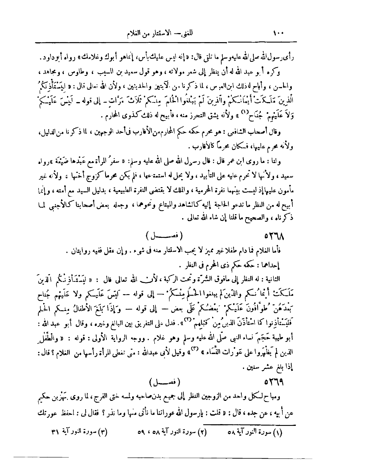 (٥٣٣٢) فَصْلٌ: فَأَمَّا الْغُلَامُ، فَمَا دَامَ طِفْلًا غَيْرَ مُمَيِّزٍ، لَا يَجِبُ الِاسْتِتَارُ مِنْهُ فِي شَيْءٍ، وَإِنْ عَقَلَ، فَفِيهِ رِوَايَتَانِ إحْدَاهُمَا: حُكْمُهُ حُكْمُ ذِي الْمَحْرَمِ فِي النَّظَرِ. وَالثَّانِيَةُ: لَهُ النَّظَرُ إلَى مَا فَوْقَ السُّرَّةِ وَتَحْتَ الرُّكْبَةِ؛ لِأَنَّ اللَّهَ تَعَالَى قَالَ {لِيَسْتَأْذِنْكُمُ الَّذِينَ مَلَكَتْ أَيْمَانُكُمْ وَالَّذِينَ لَمْ يَبْلُغُوا الْحُلُمَ مِنْكُمْ} [النور: ٥٨] إلَى قَوْله تَعَالَى {لَيْسَ عَلَيْكُمْ وَلا عَلَيْهِمْ جُنَاحٌ بَعْدَهُنَّ طَوَّافُونَ عَلَيْكُمْ بَعْضُكُمْ عَلَى بَعْضٍ} [النور: ٥٨] إلَى قَوْلِهِ: {وَإِذَا بَلَغَ الأَطْفَالُ مِنْكُمُ الْحُلُمَ فَلْيَسْتَأْذِنُوا كَمَا اسْتَأْذَنَ الَّذِينَ مِنْ قَبْلِهِمْ} [النور: ٥٩] فَدَلَّ عَلَى التَّفْرِيقِ بَيْنَ الْبَالِغِ وَغَيْرِهِ.